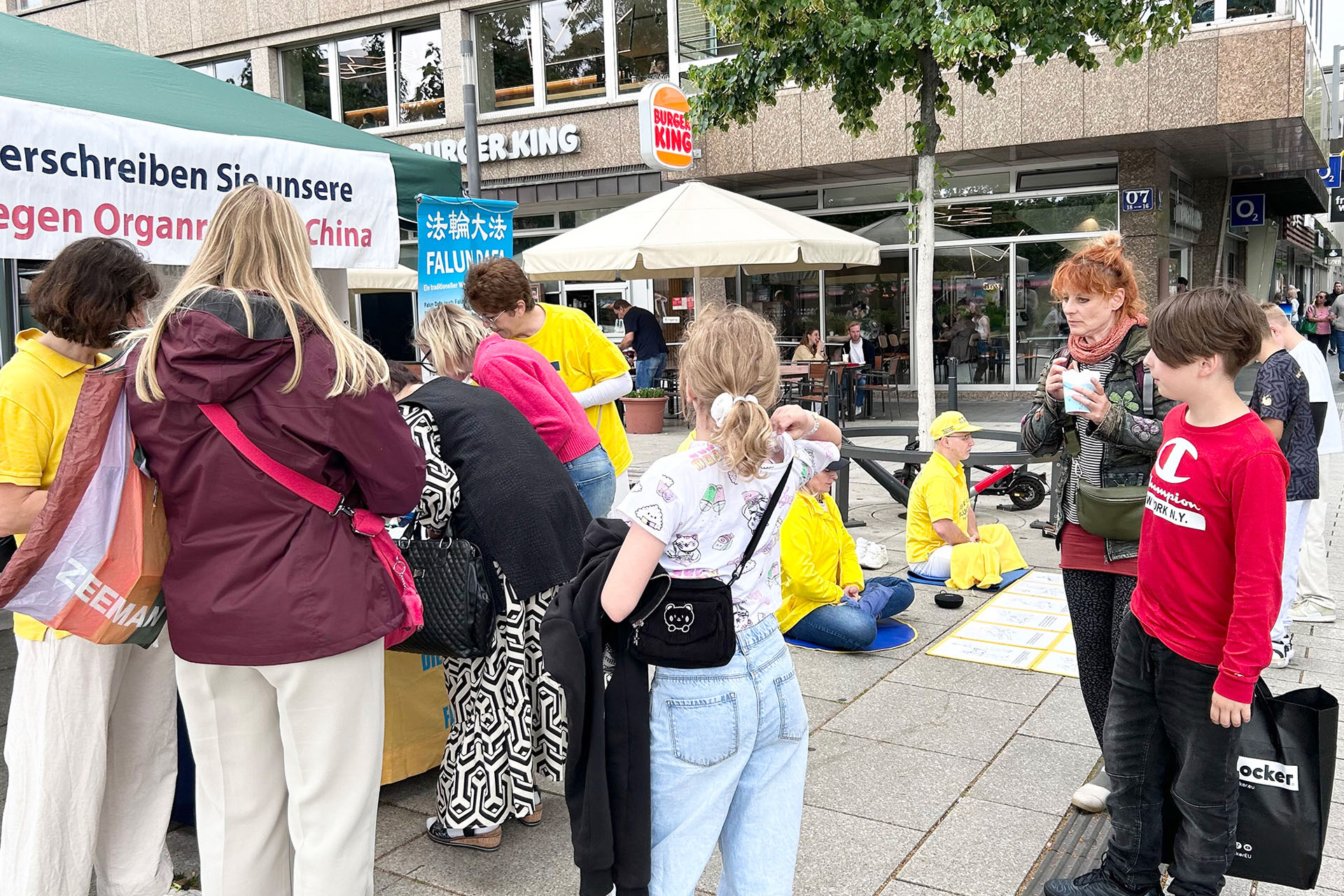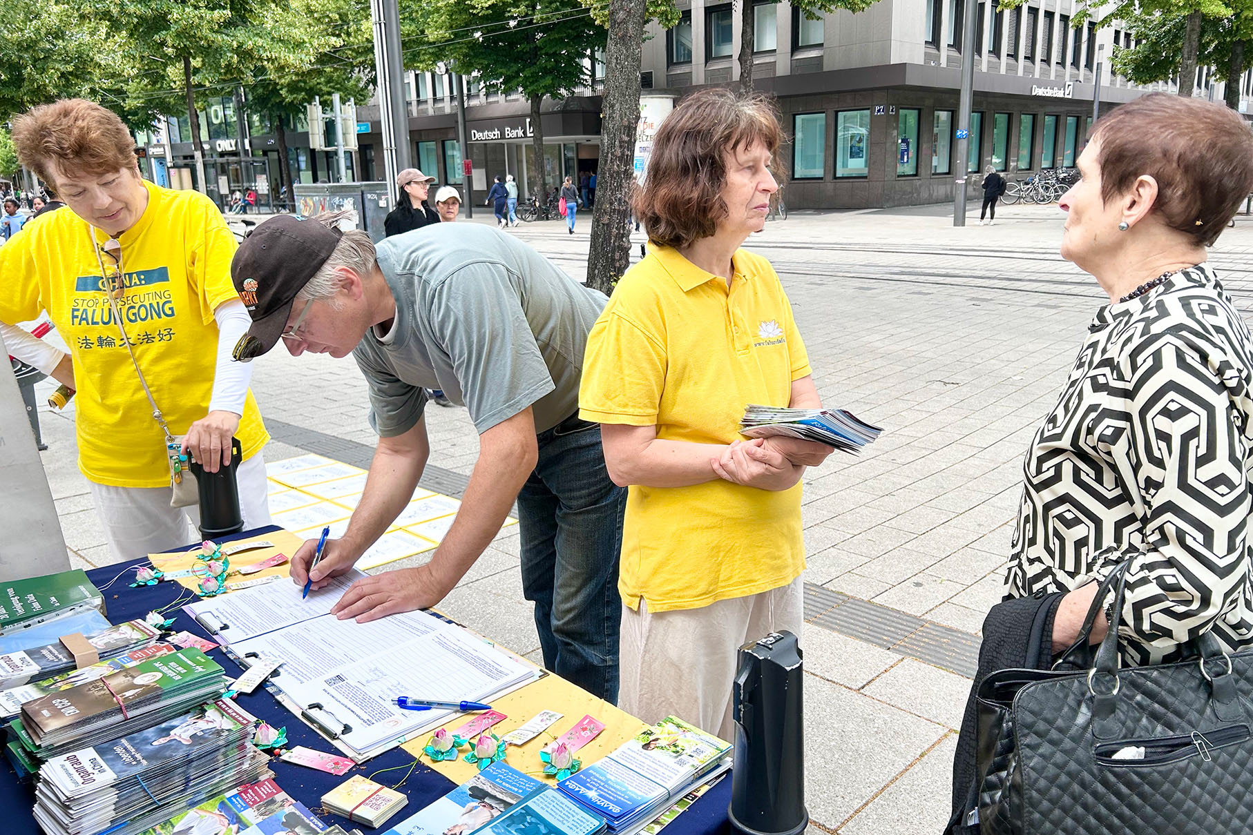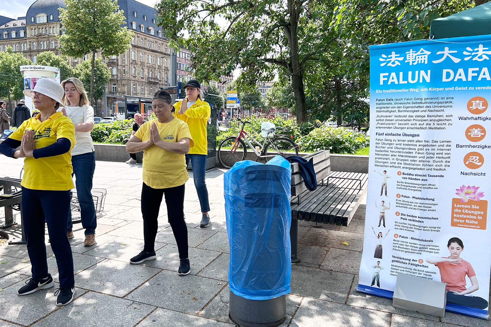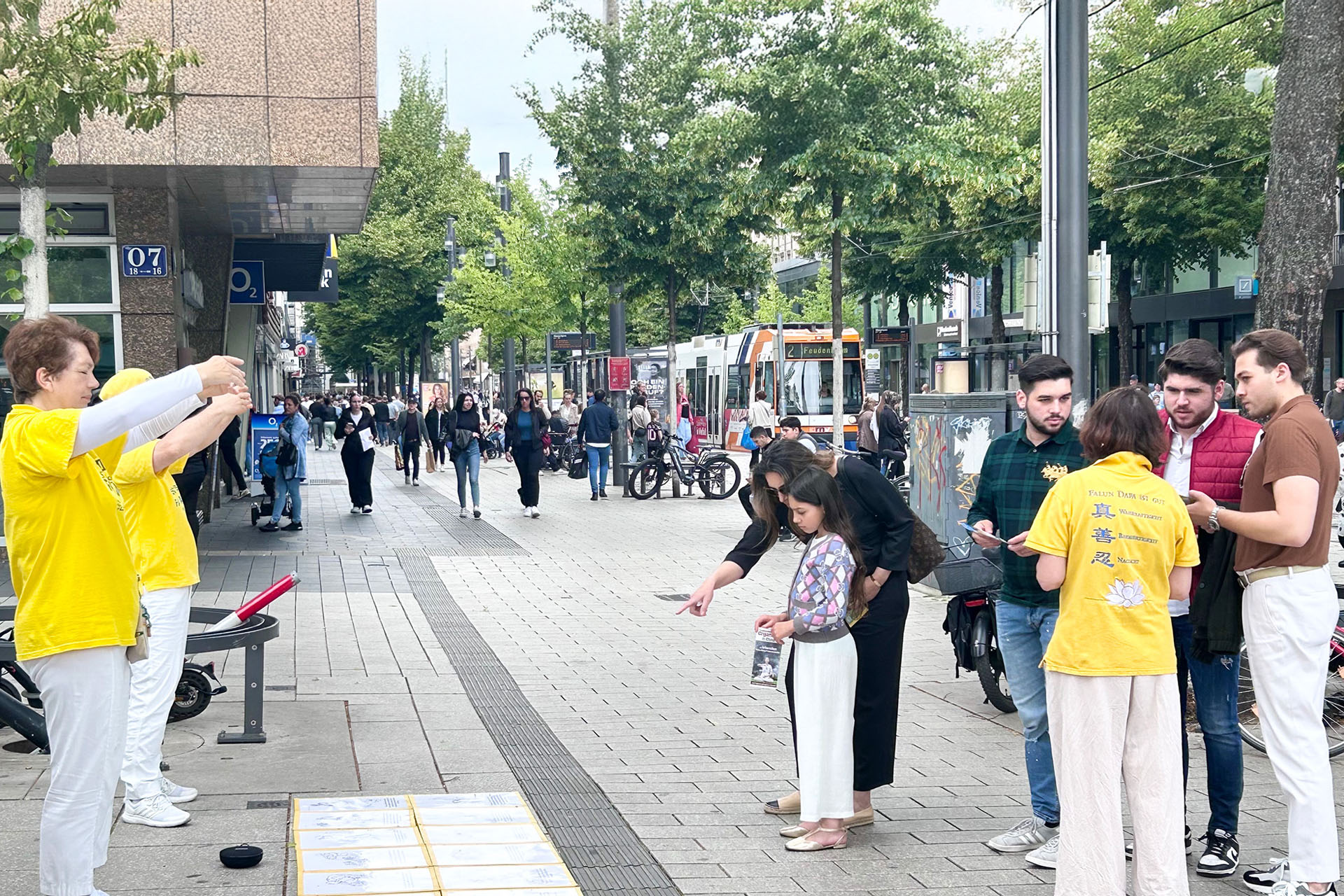 法轮功学员的信息展台如往常一样搭在了曼海姆(Mannheim)购物主街的入口处。炼功音乐响起,有的学员展示功法,有的向过往行人发送真相资料和介绍法轮功,告诉人们什么是法轮功和修炼的美好,并揭露中共对法轮功持续至今长达二十六年的残酷迫害。