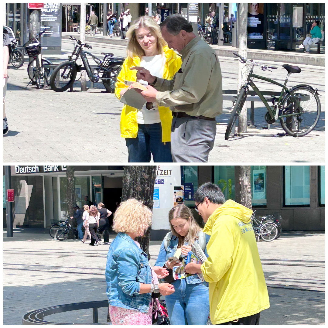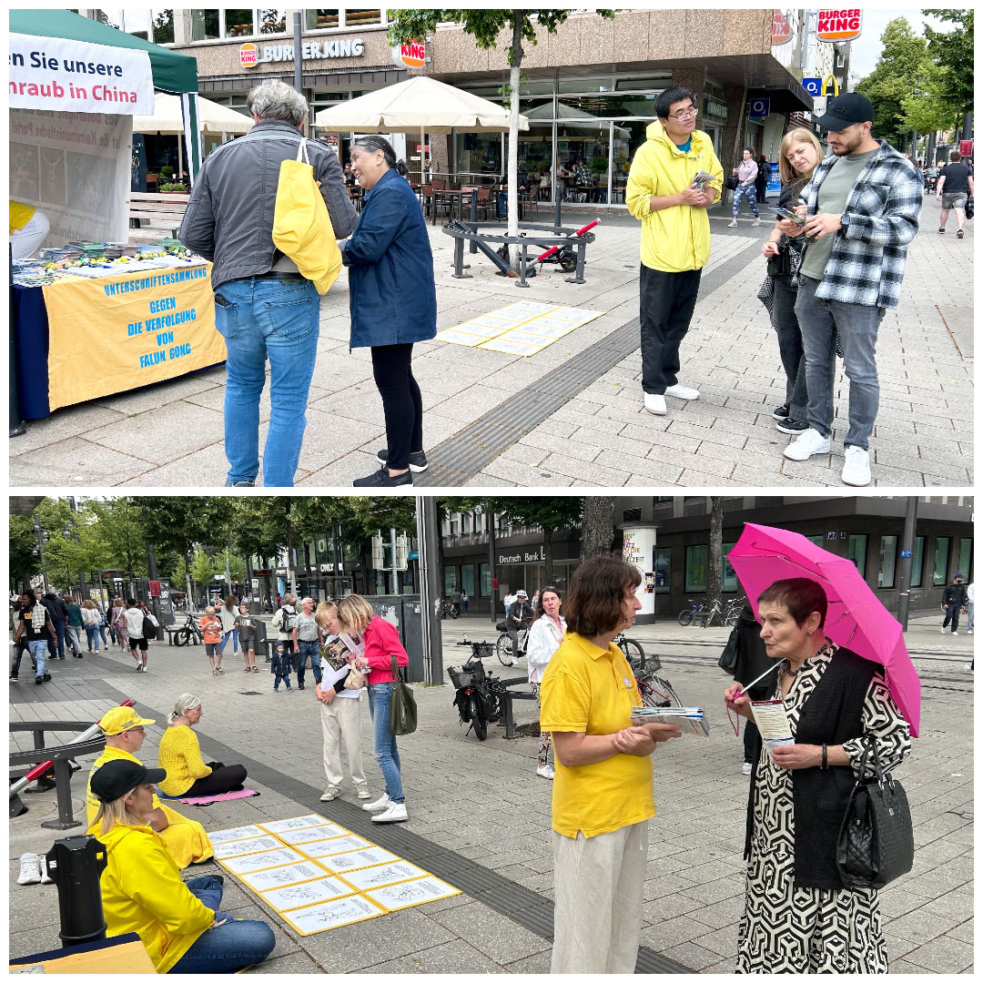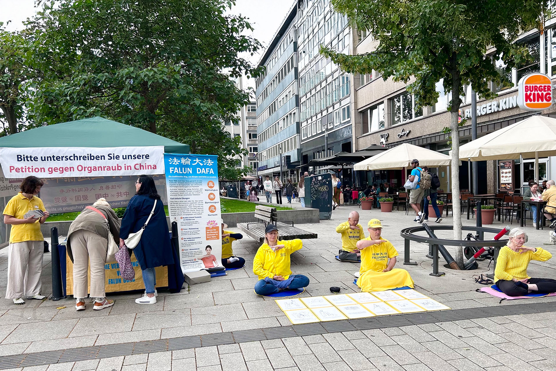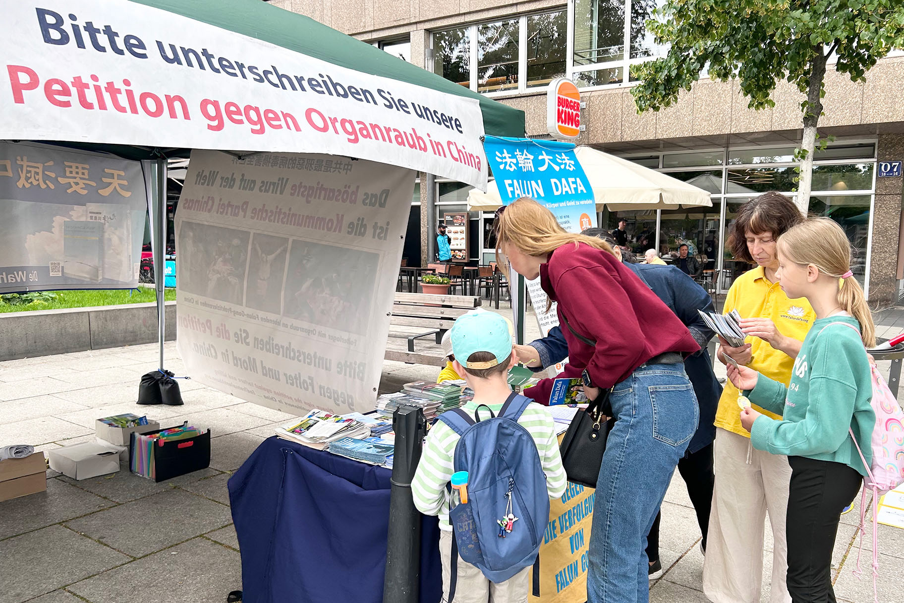 法轮功学员的信息展台如往常一样搭在了曼海姆(Mannheim)购物主街的入口处。炼功音乐响起,有的学员展示功法,有的向过往行人发送真相资料和介绍法轮功,告诉人们什么是法轮功和修炼的美好,并揭露中共对法轮功持续至今长达二十六年的残酷迫害。