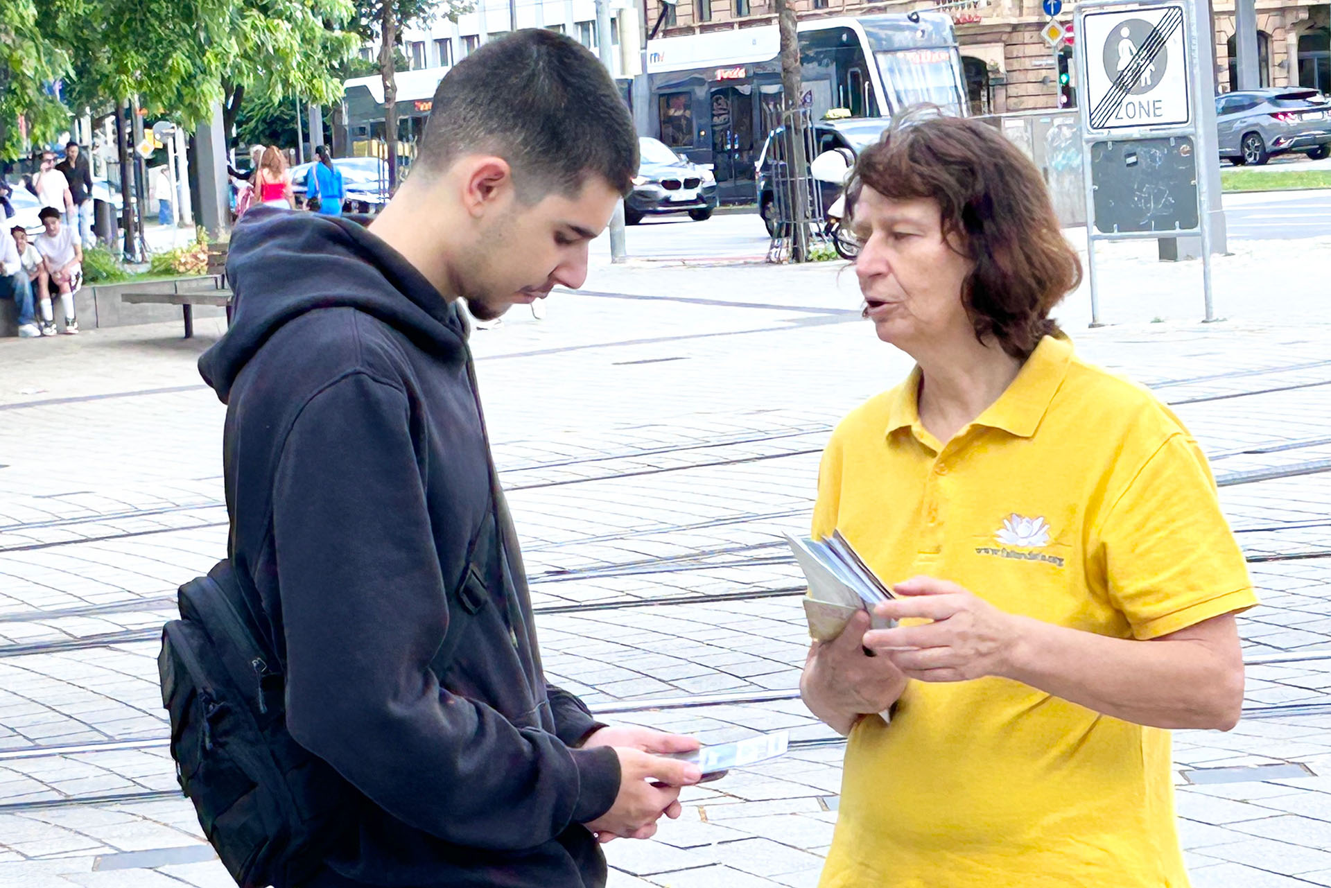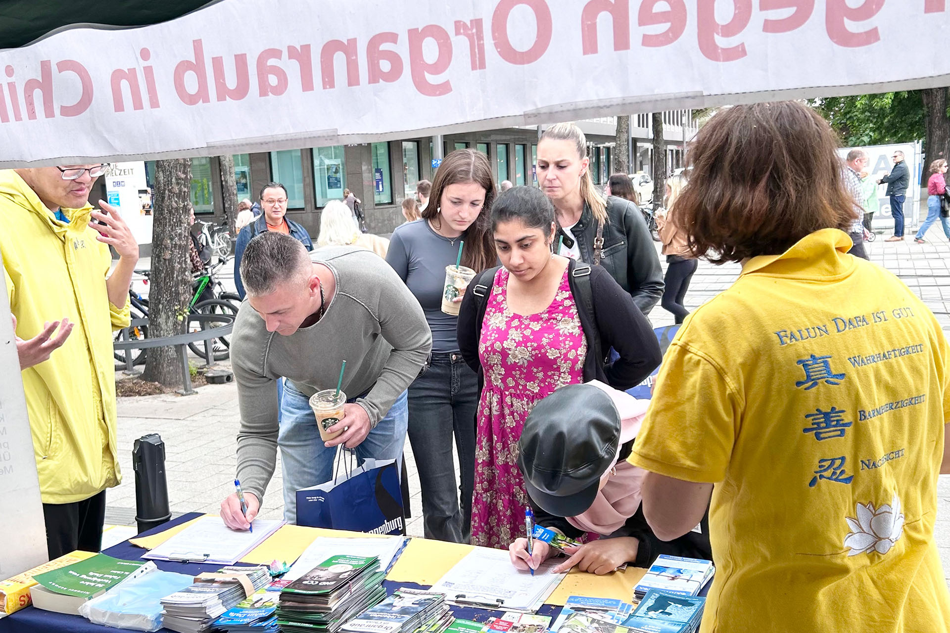 阿布杜‧贾法尔(Abdu Jafar)也是一名学生,他说,“刚才那位女士(法轮功学员)告诉我,在中国(修炼的)人被抓捕,器官被随意摘除。所以我签名,希望德国政府可以伸出援助之手,解决这个问题。”
