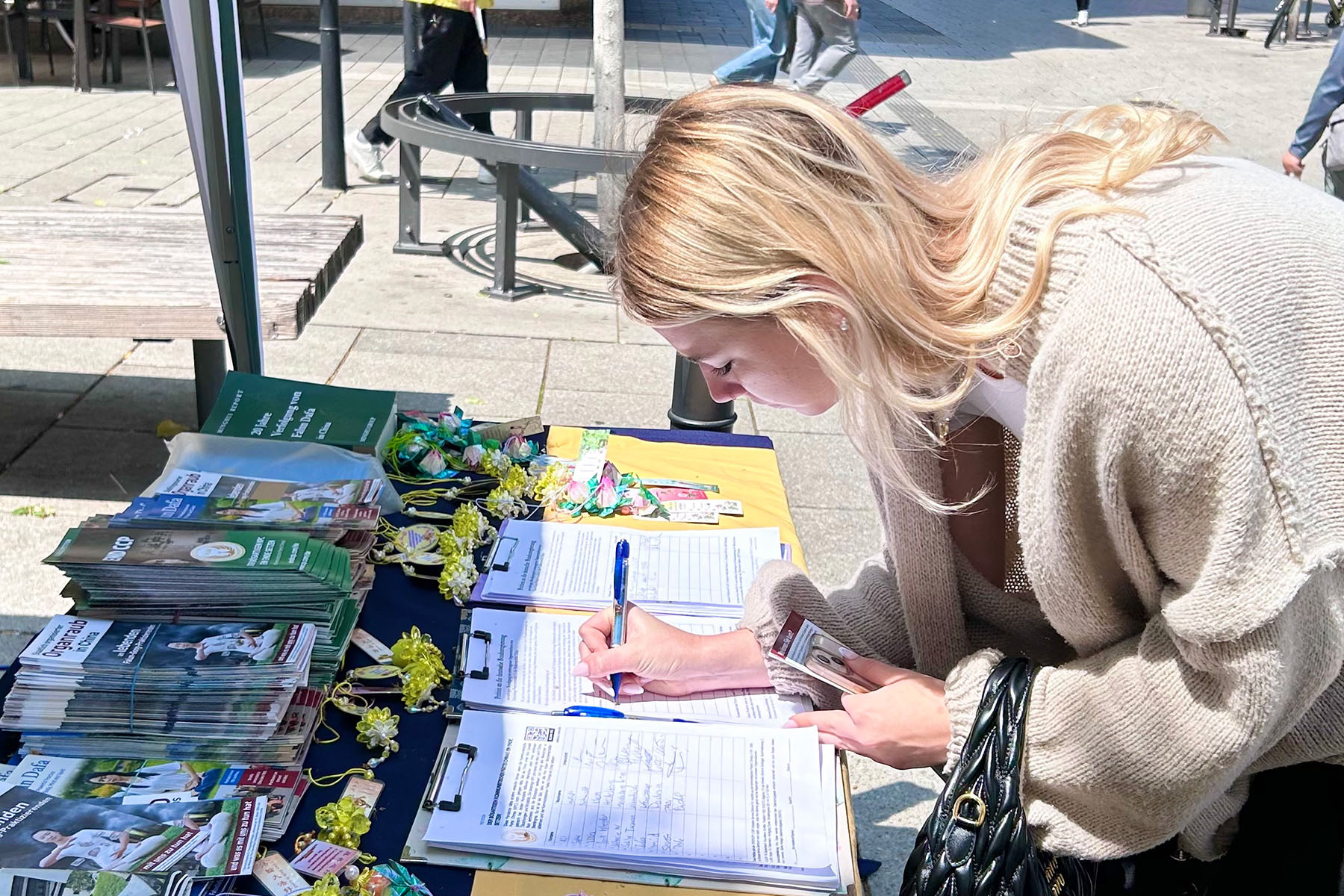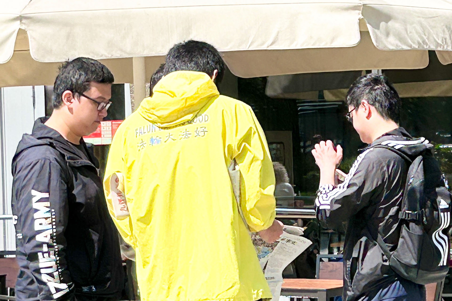 还有一位德国中年男子与友人从步行街对面的水塔方向走来。他毫不犹豫地签了名并对学员说,“现在虽然德国在经济上尤其是供应链的需求对中国还有一定的依赖性。但象今天这样的事,我会坚定地站在正义的一方。祝你们成功!”