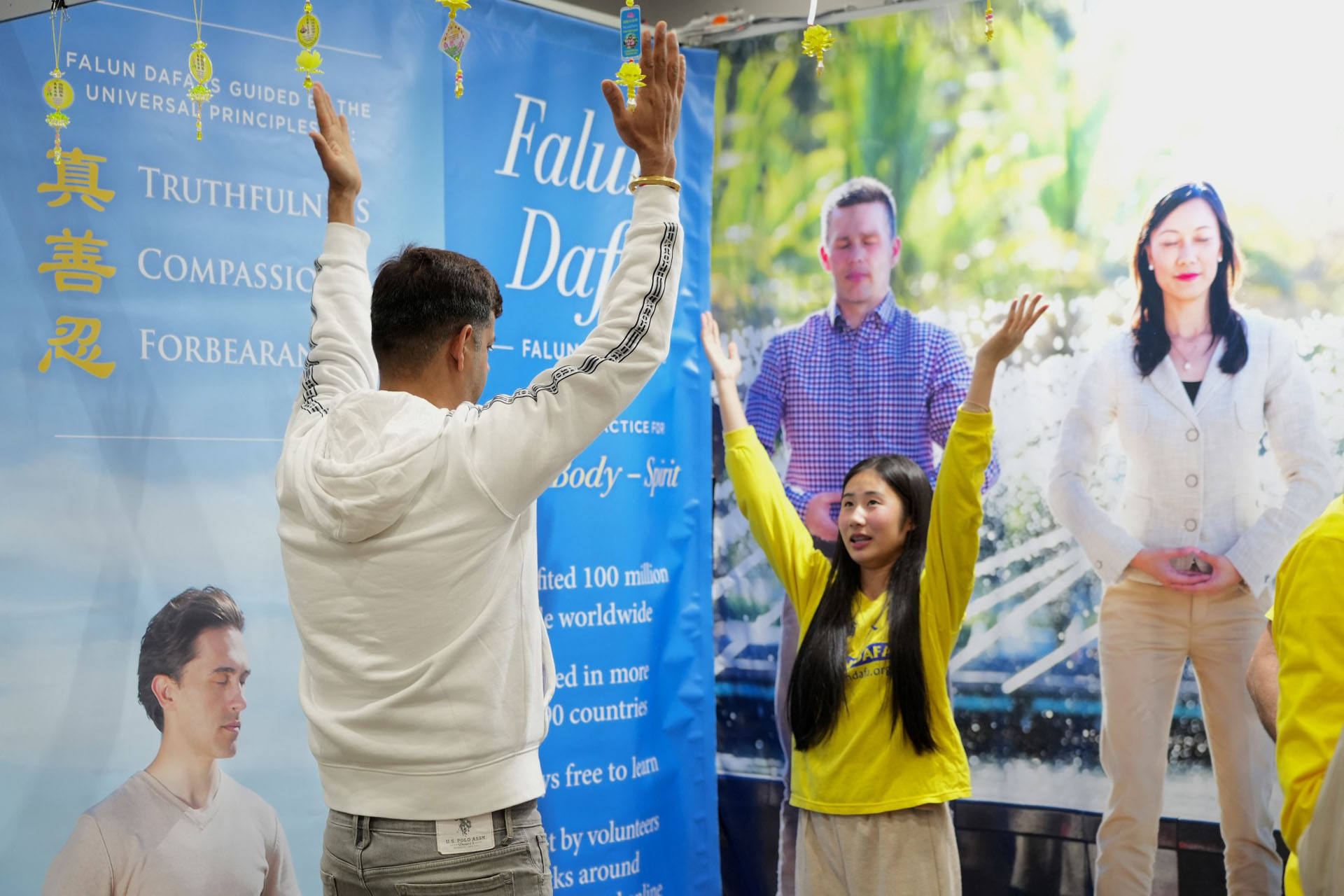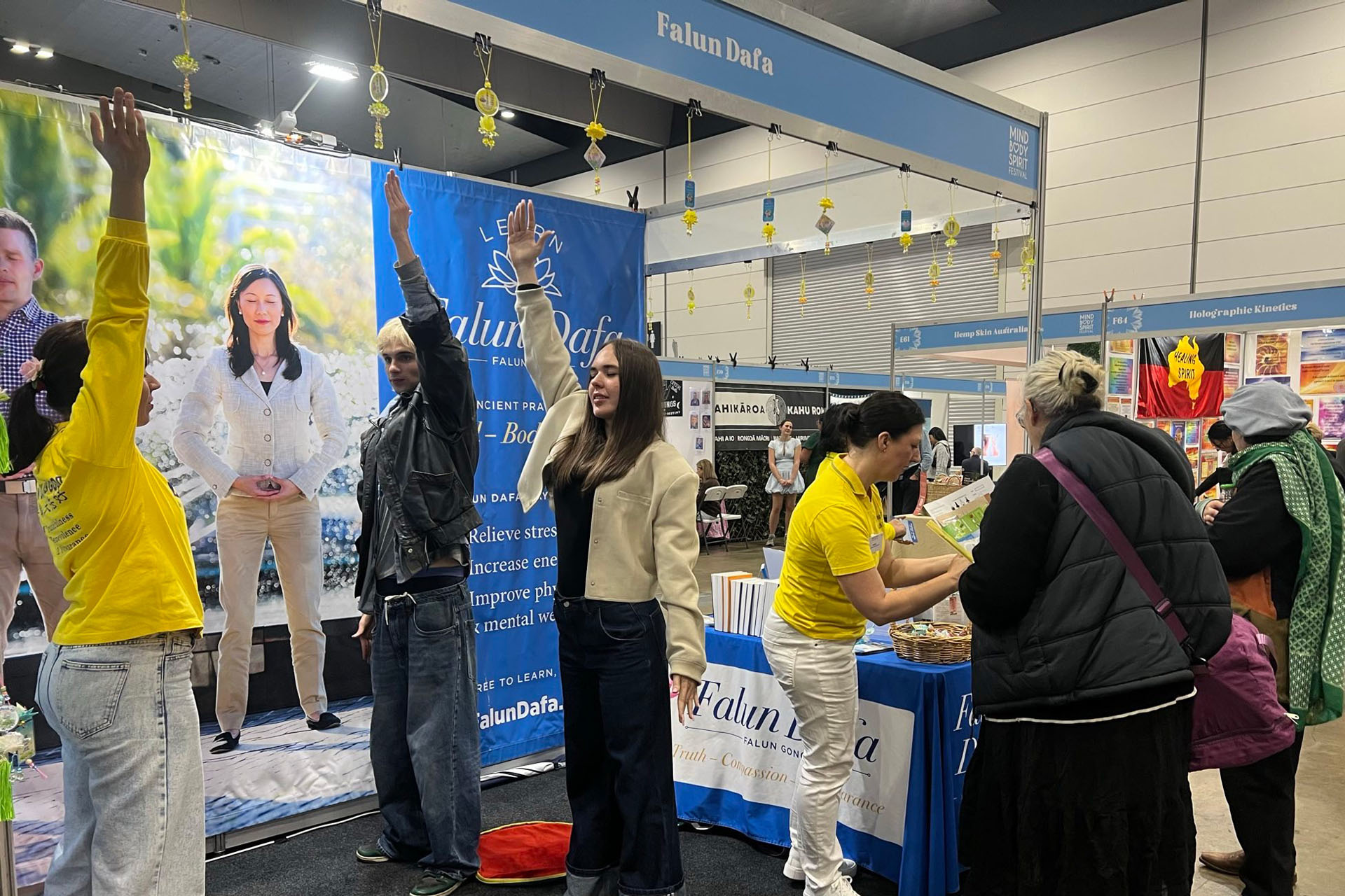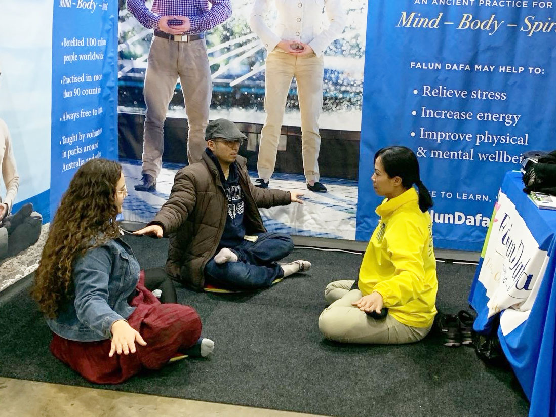法轮大法展位祥和的能量场吸引观众驻足了解详情,有人当场学炼功法,很多人表示了加入炼功点或网上教功课程的愿望。还有不少观众在得知法轮大法以真、善、忍为修炼标准,各国学员过去二十六年来坚持和平理性反迫害的历程后,表达了对法轮大法的深深敬意和支持。