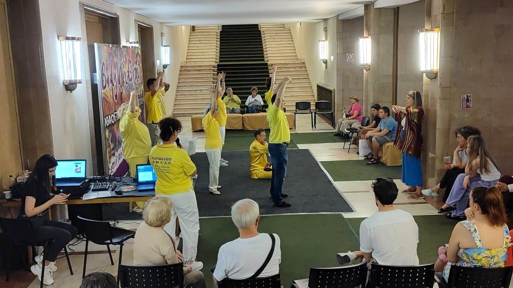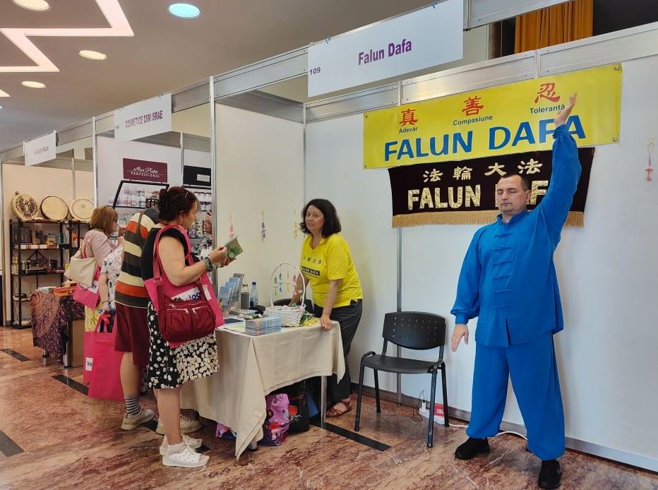 ![]() 图1:二零二五年六月八日,在罗马尼亚布加勒斯特皇宫大厅,法轮功学员在身心灵博览会上演示功法。 |