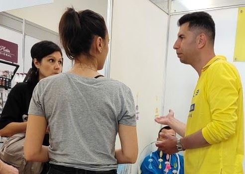 税务专家丹·阿里丘(Dan Ariciu)此前就听说过法轮功的美好,所以来到展位前深入了解大法。