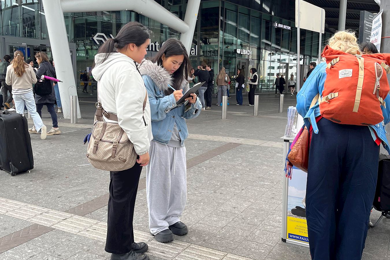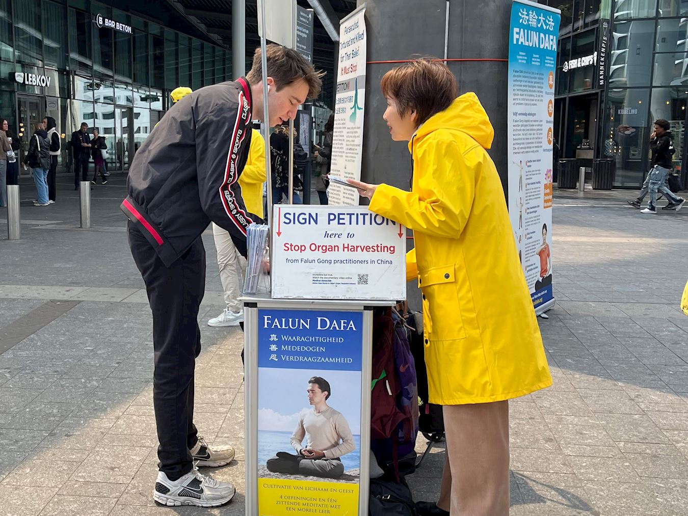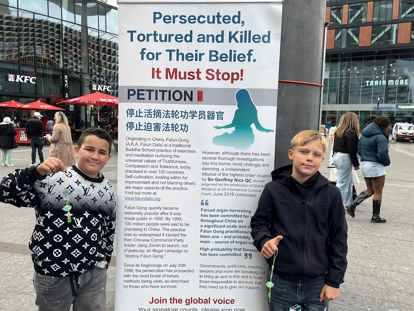 两名年轻的学生马兰·滕·布尔克(Maran ten Brink)和吉里斯·卢基利(Giris Looukili)对遵循真、善、忍的法轮功学员在中国遭受的迫害表示震惊。