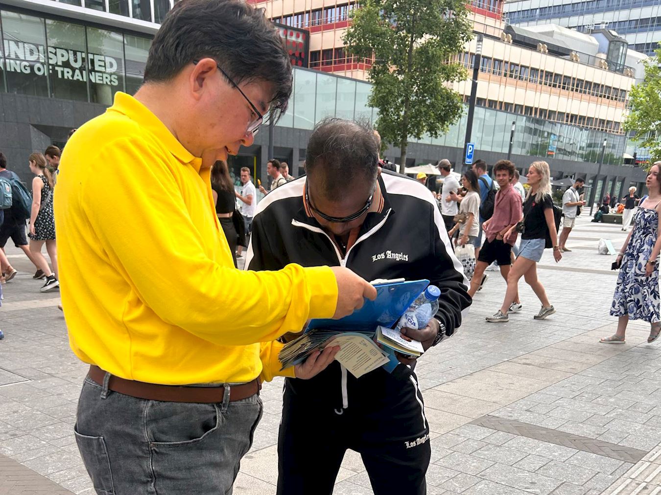 许多人停下脚步来了解法轮大法,他们被真、善、忍的信息所感动,并对法轮大法的普世价值和法轮功学员和平理性的反迫害方式表示钦佩,许多人主动在请愿书上签名,表达对法轮功的支持。
