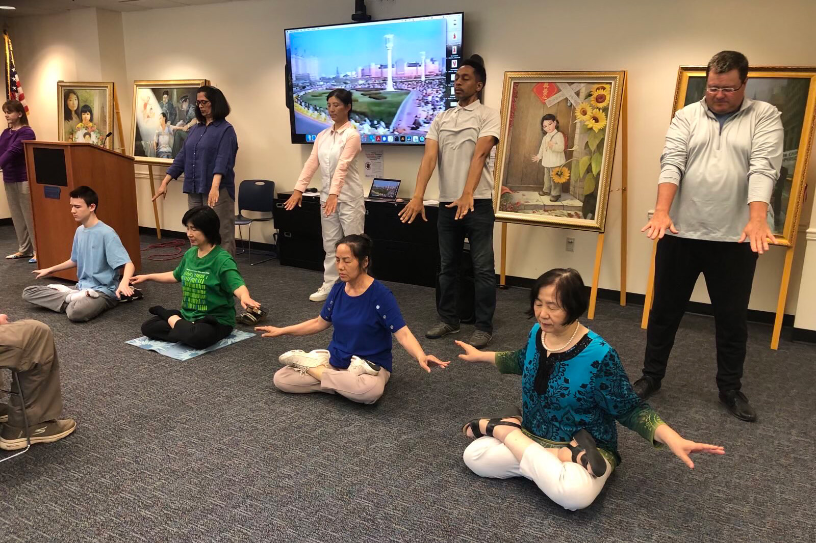 ![]() 图2:法轮功学员现场给候选人们作功法演示。 |