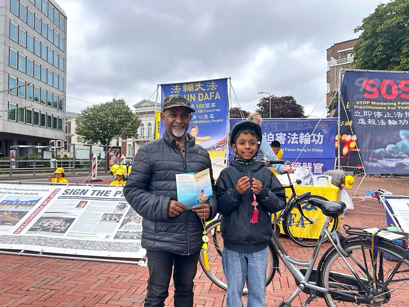 菲拉伊(Hariaum Pherai)先生带着儿子艾利亚(Ehiaya)骑车经过法轮功学员举办反迫害活动地点,被学员祥和的炼功场面吸引,他说自己也练习过瑜伽,他很喜欢法轮功学员的打坐,充满了灵性,他知道打坐对人的健康有益,当得知这样的祥和功法在中国被中共禁止并迫害时,他立即签名支持法轮功反迫害,并说:“我觉得每个人都应该炼,中国政府也应该支持,为什么不呢?这样他们就能有健康的国民。”