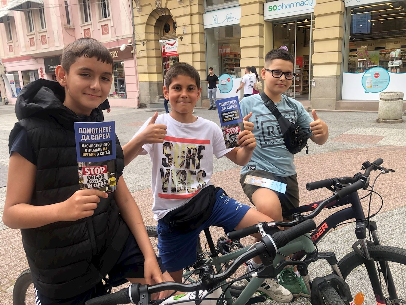 伊维安(Ivian)、莫姆奇尔(Momchil)和乔纳森(Jonathan)今年都是十二岁,他们在信息展位前停下来询问是什么活动,学员向他们介绍了法轮功真相,三个男孩对中共的暴力和残酷感到难以接受,并表示理解法轮功学员讲真相的重要性和深刻内涵。