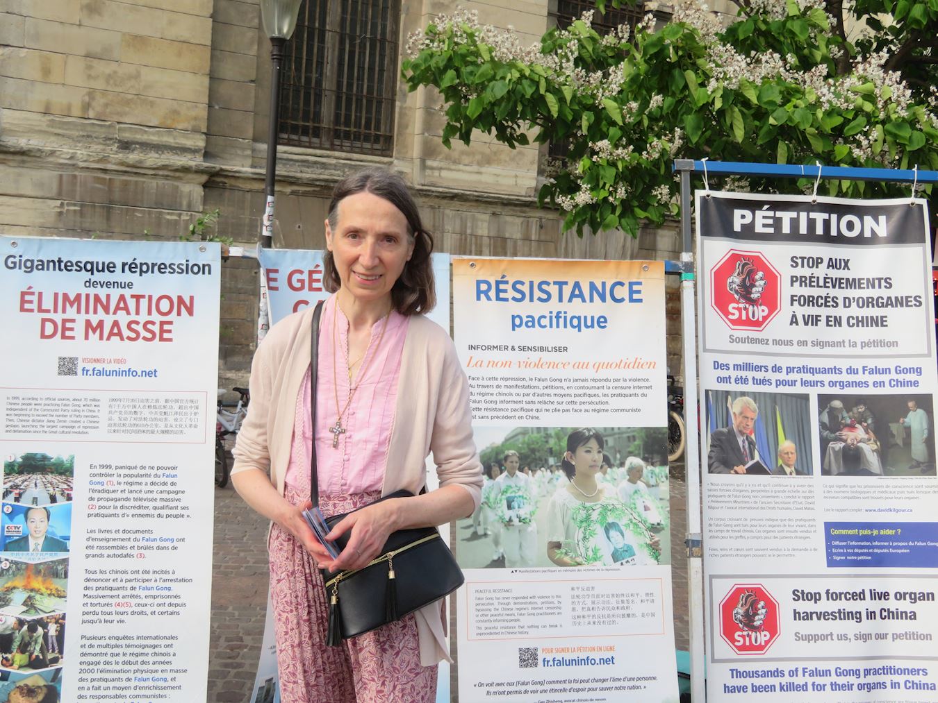 纪尧梅特(Guillaumette)曾经在药学实验室工作。她被中共的活摘器官行径震惊,在反迫害征签表上签字后,她说:“你们在这里揭露真相很好,因为当你们说出来时,人们会意识到,这有助于事情的进展。