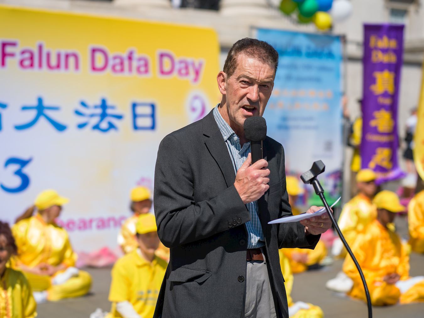 二零二五年五月十日,英国法轮功学员在伦敦市中心举行盛大游行集会,英国著名人权活动家——保守党人权委员会副主席本尼迪克特·罗杰斯(Benedict Rogers)到场发表演讲,他说:“作为法轮功修炼者,你们坚持的真、善、忍这三大价值,不仅是法轮大法的价值观,也是我作为一名基督徒所认同的价值观;更是许多其他宗教信仰者的共同信念。这些价值观是普世的,是整个人类的共同财富。”