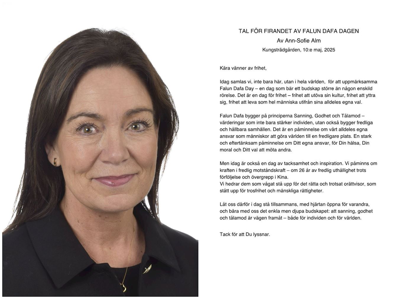 瑞典国会议员安-索菲·阿尔姆(Ann-Sofie Alm)在信中表示,“今天我们在这里,不仅在这里,而是在世界各地,共同庆祝‘法轮大法日’ —— 这一天代表的意义比任何一个运动都要伟大,因为这一天是标志自由的日子 :文化自由,言论自由,可以按照自己选择而活的完整的人生自由。