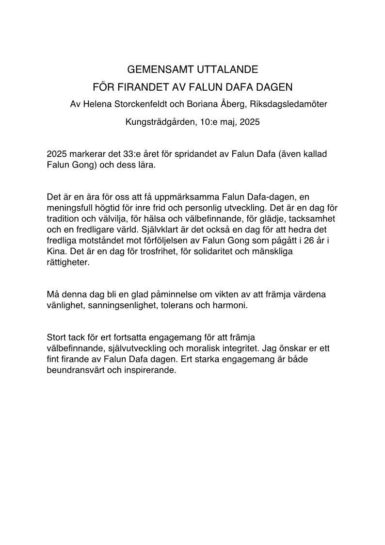 瑞典国会议员海伦娜·斯图肯费尔德(Helena Storckenfeldt)和国会议员博里亚娜·奥伯格(Boriana Åberg)在共同贺信中表示,“我们很荣幸庆祝法轮大法日,这是一个意义非凡的庆祝活动,让人内心平静和个人提升。这一天也是在庆祝传统与善意、庆祝健康和幸福、庆祝欢乐、感恩和世界更加和平美好。