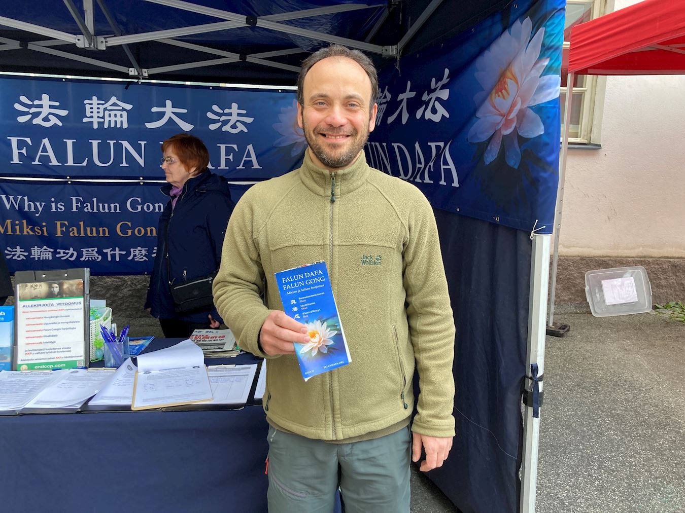 隔壁摊位的马蒂亚斯(Matias)主动前来签名。在交谈中得知,他十几年前曾居住在首都赫尔辛基,并在火车站看见法轮功学员的弘法活动,因此对法轮功遭受的迫害已有一定了解。他表示,当年得知活摘器官的情况时感到震惊,并指出这类严重的事件在媒体中很少被报道。