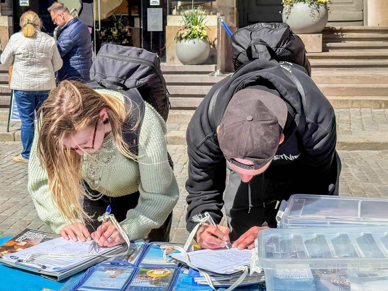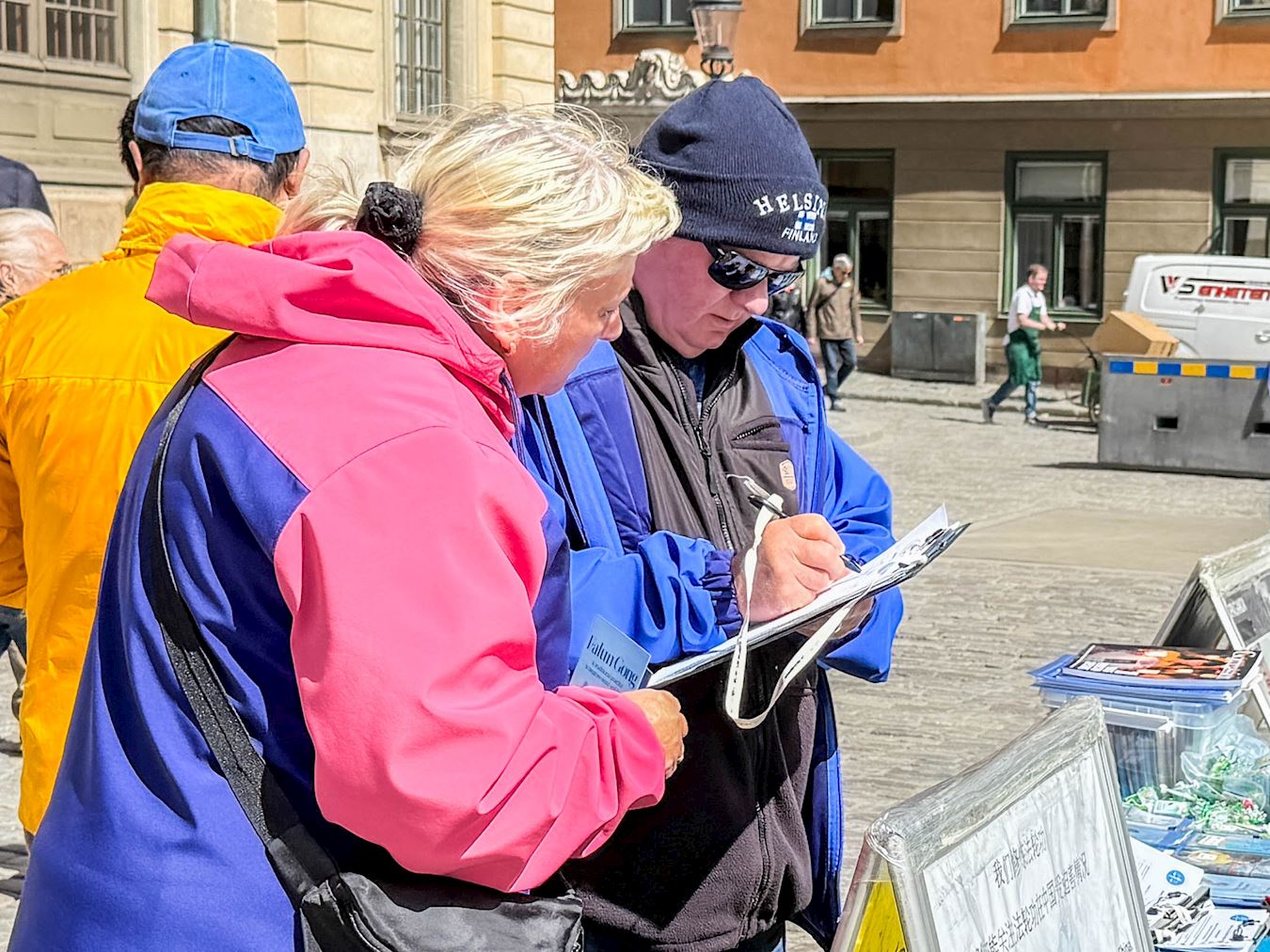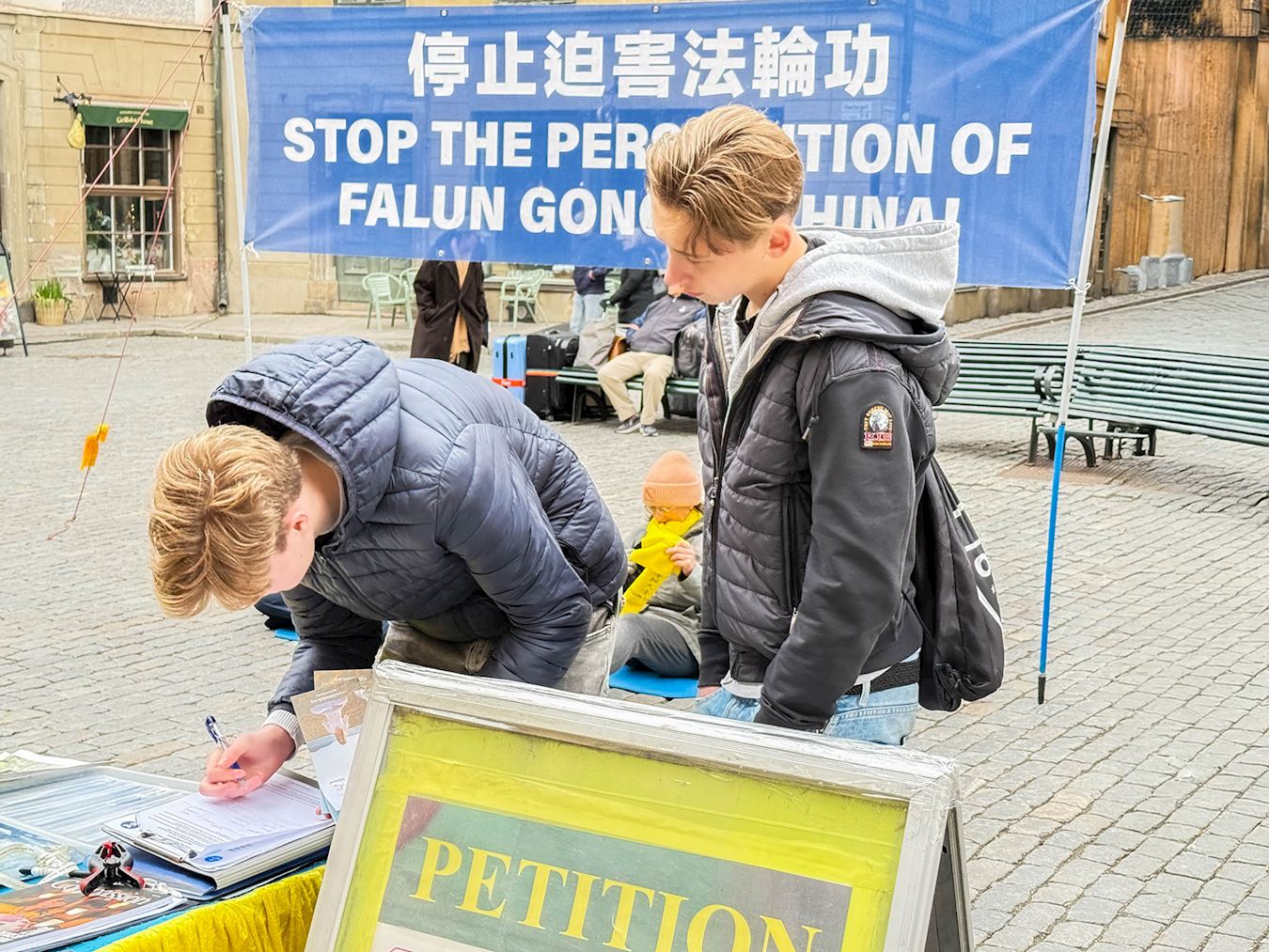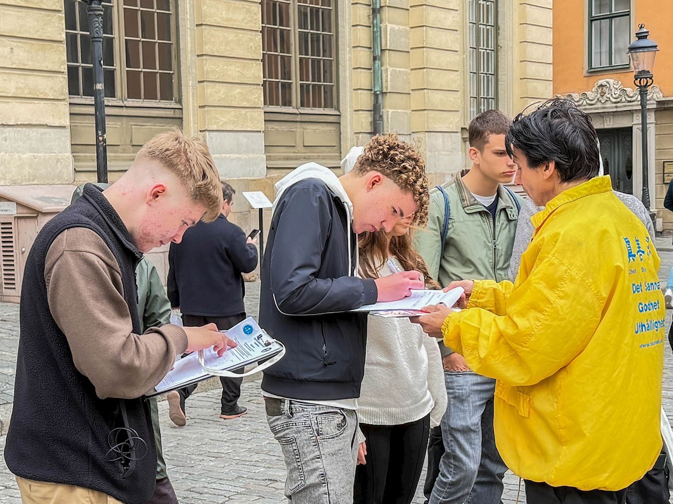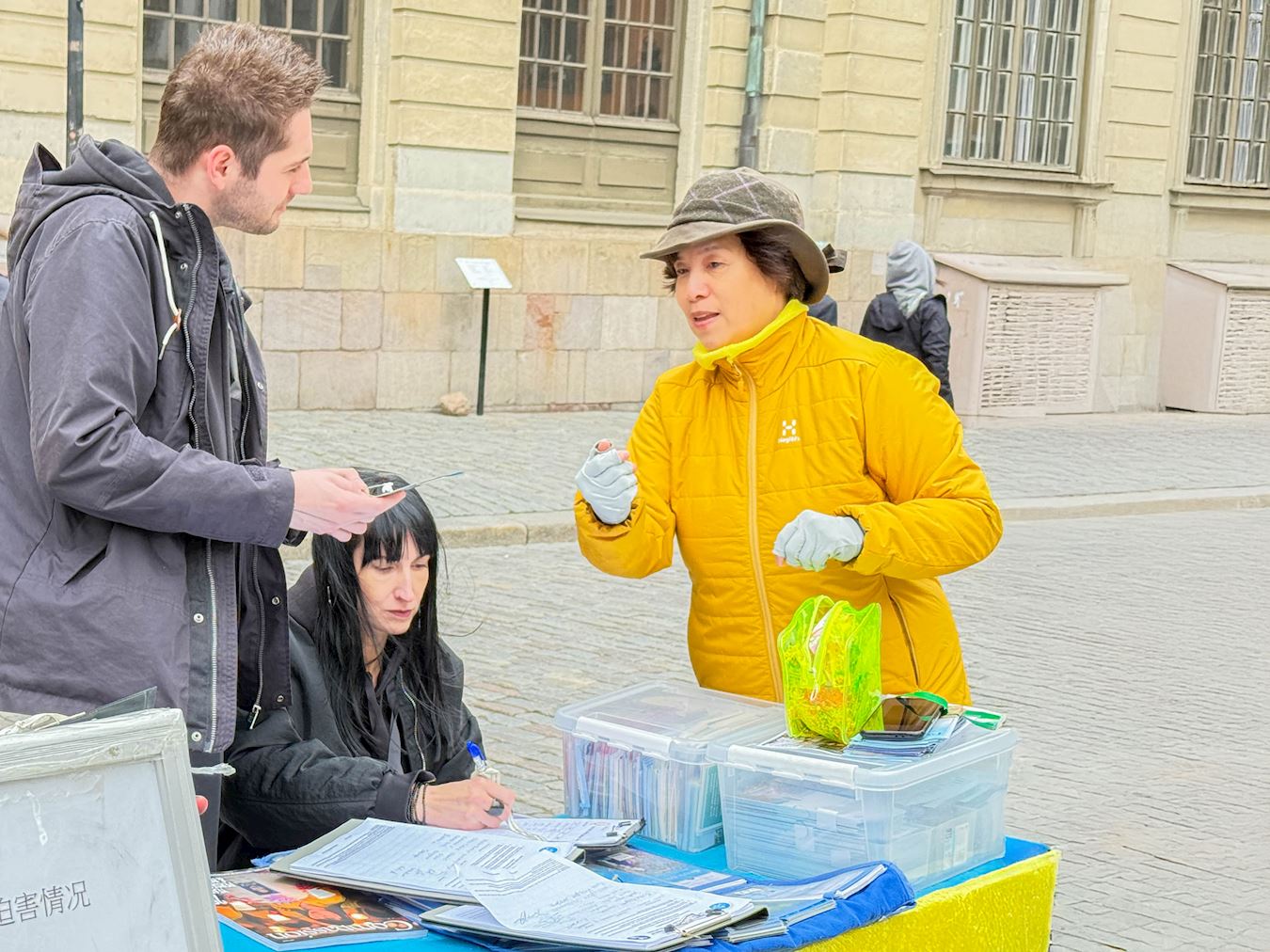 一个周五的下午,年轻的瑞典导游盖娅(Gaia)女士送走了她的客人后,径直来到摊位前,仔细阅读着展板上的信息。盖娅是一位意大利人,目前她正在瑞典读硕士,同时还做着一份导游的兼职。得知中共活摘法轮功学员器官的真相后,她感到很震惊,立即签名并表示:“必须制止这个罪行!”同时她还想进一步了解详情,急切地询问:“什么是法轮功?中共为什么要迫害法轮功?怎么样才能帮助你们(法轮功学员)?”