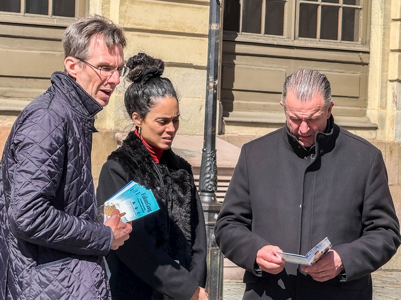 ![]() 图1~3:二零二五年五月三十一日,法轮功学员在瑞典诺贝尔博物馆(Nobelmuseet)门前举办的讲真相、反迫害征签活动。 |