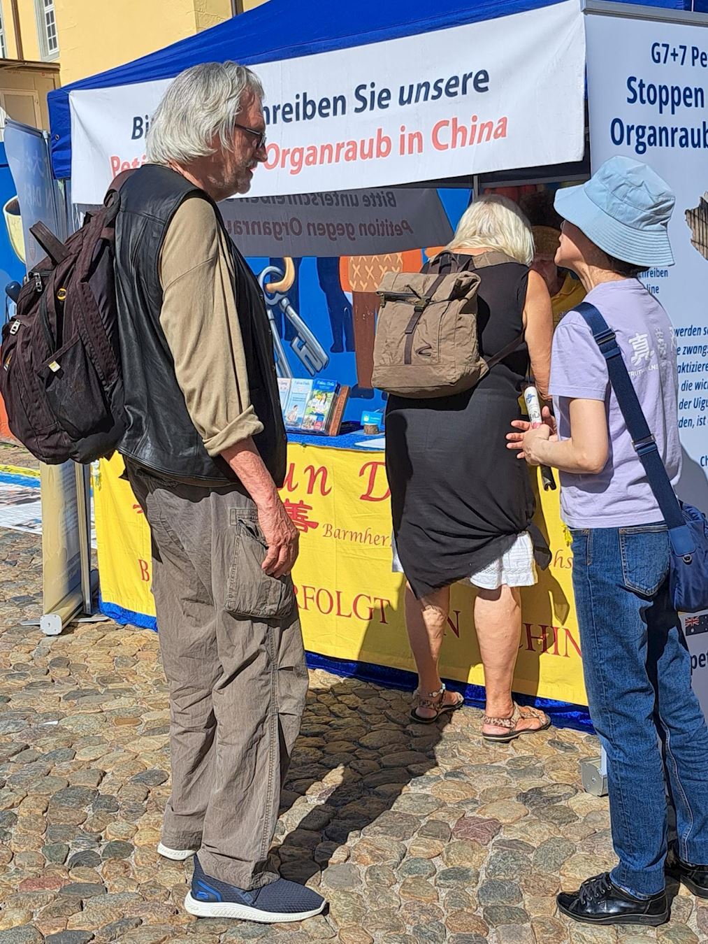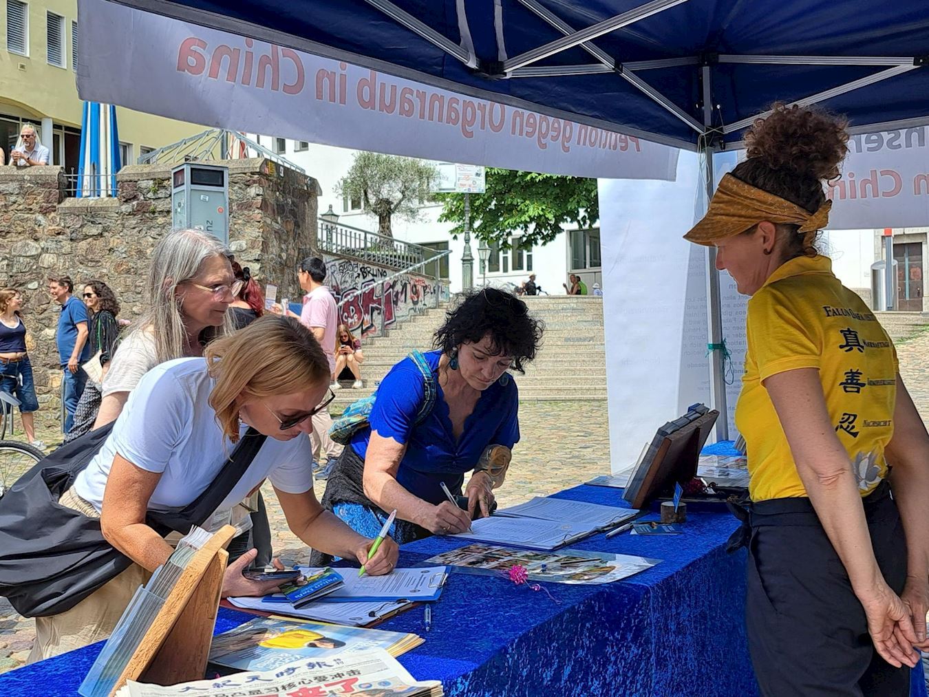 当天天气晴朗,加上周末,不少购物逛街的路人与游客来来往往。法轮功学员的活动吸引了大家的关注,不少人停下脚步与学员交谈。了解了法轮功修炼真、善、忍,中共在迫害好人之后,不少人纷纷签名声援法轮功学员反迫害。也有的人之前已经听说过相关真相,他们径直走向信息台前签名声援。