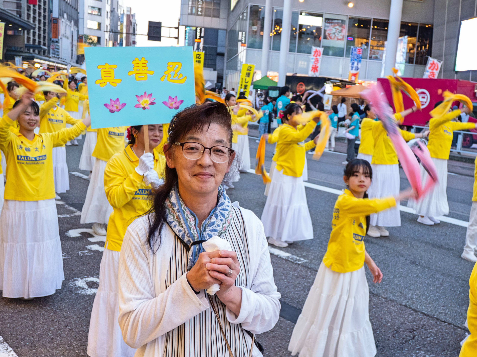 木谷女士观看学员们的舞蹈后表示,学员们的服装整齐划一,让人很容易理解法轮功是源于中国传统文化的团体。她说:“大家穿着一致,很有气势。一开始我在想这是什么团体,但很快就明白是来自中国的。”她还赞同地说:“真、善、忍理念非常棒。”