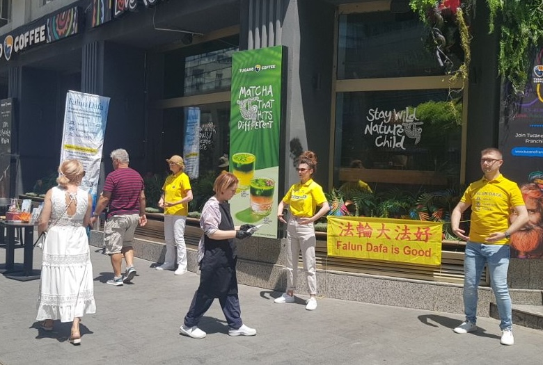 布加勒斯特的活动源于一位明真相的女士,她是东欧一家连锁咖啡店的市场部员工,曾在街上偶遇法轮功学员并有缘听闻了真相。她对法轮大法的美好和真、善、忍的原则非常认同。回去后这位女士主动联系当地学员,邀请他们在维多利亚大道前的咖啡店前举办这次活动。
