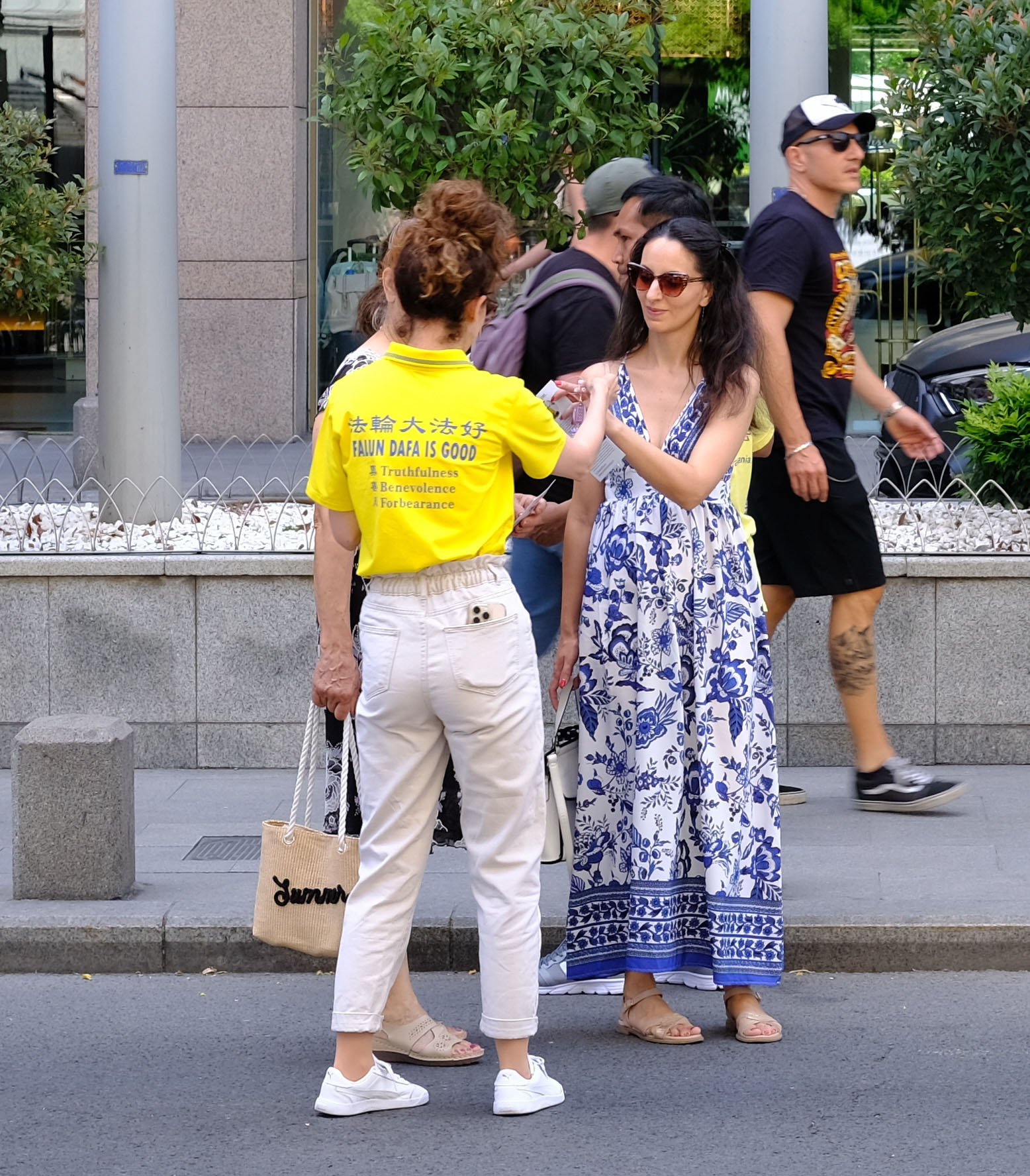 还有一位女士详细了解了法轮大法及其在中国共产党政权下遭受的迫害后,完全明白了真相,离开前她接过小莲花和传单,并祝愿学员们成功。