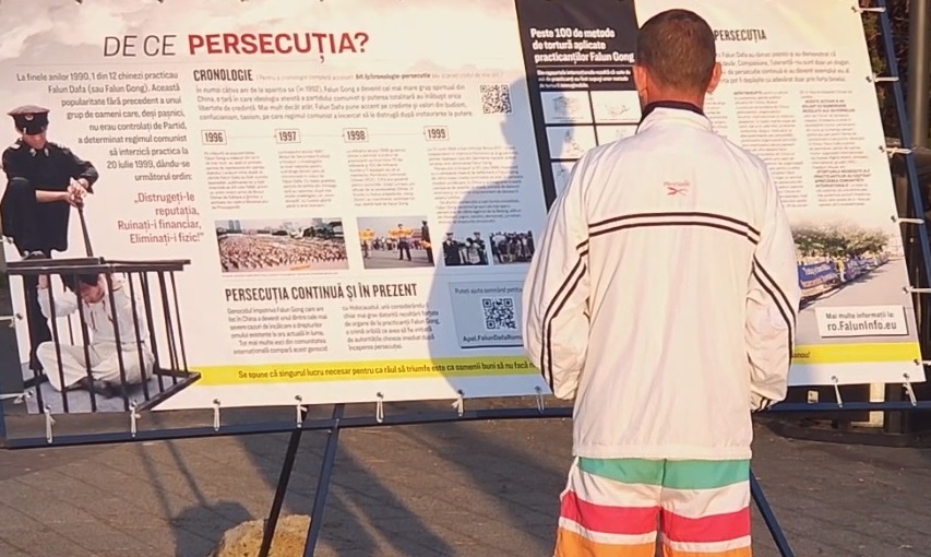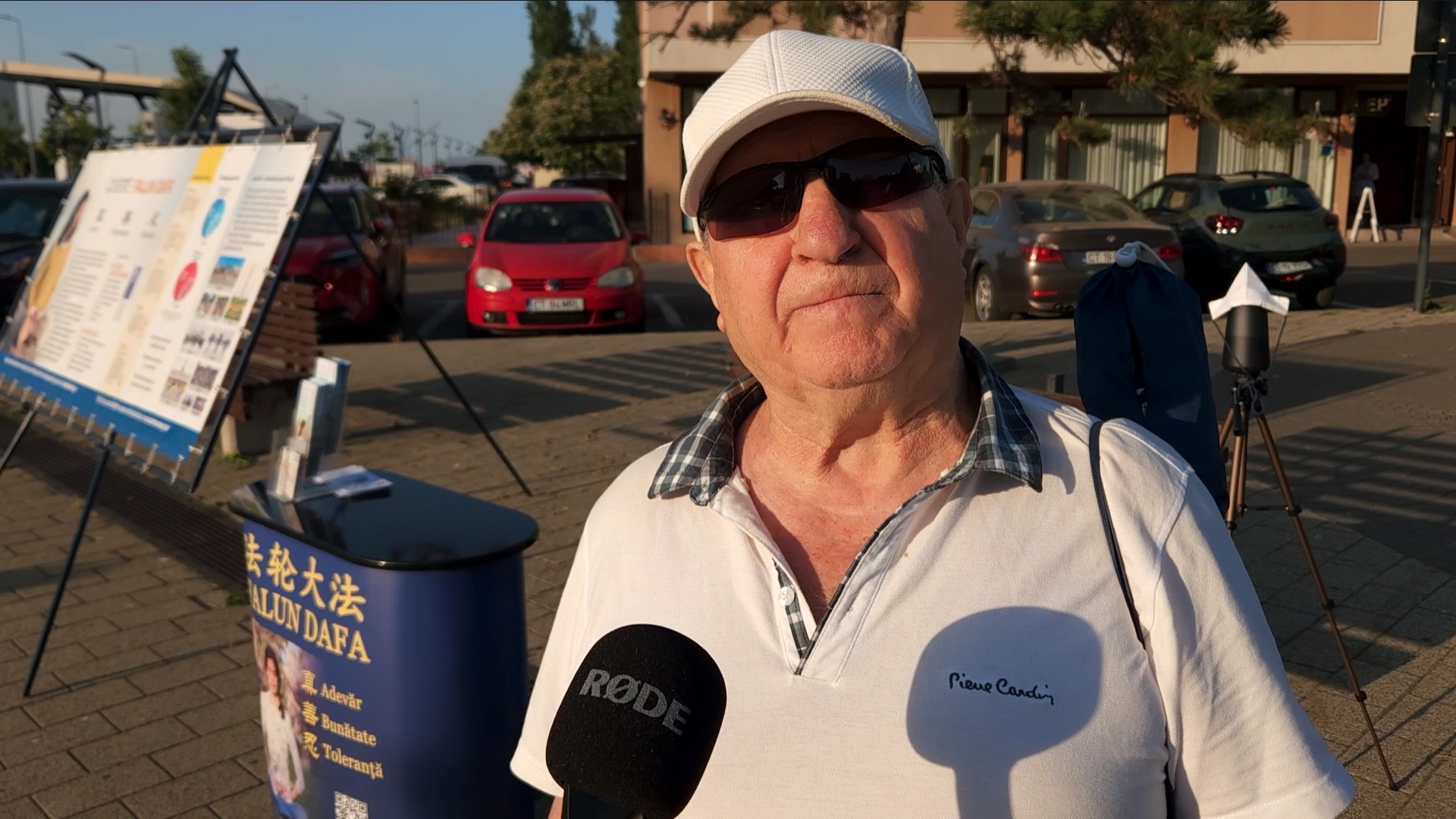 制止中共迫害的标语引起了路人康斯坦丁·卢卡(Constantin Luca)的注意,学员向他讲述了法轮大法被迫害的情况,卢卡强烈谴责了中共的迫害。