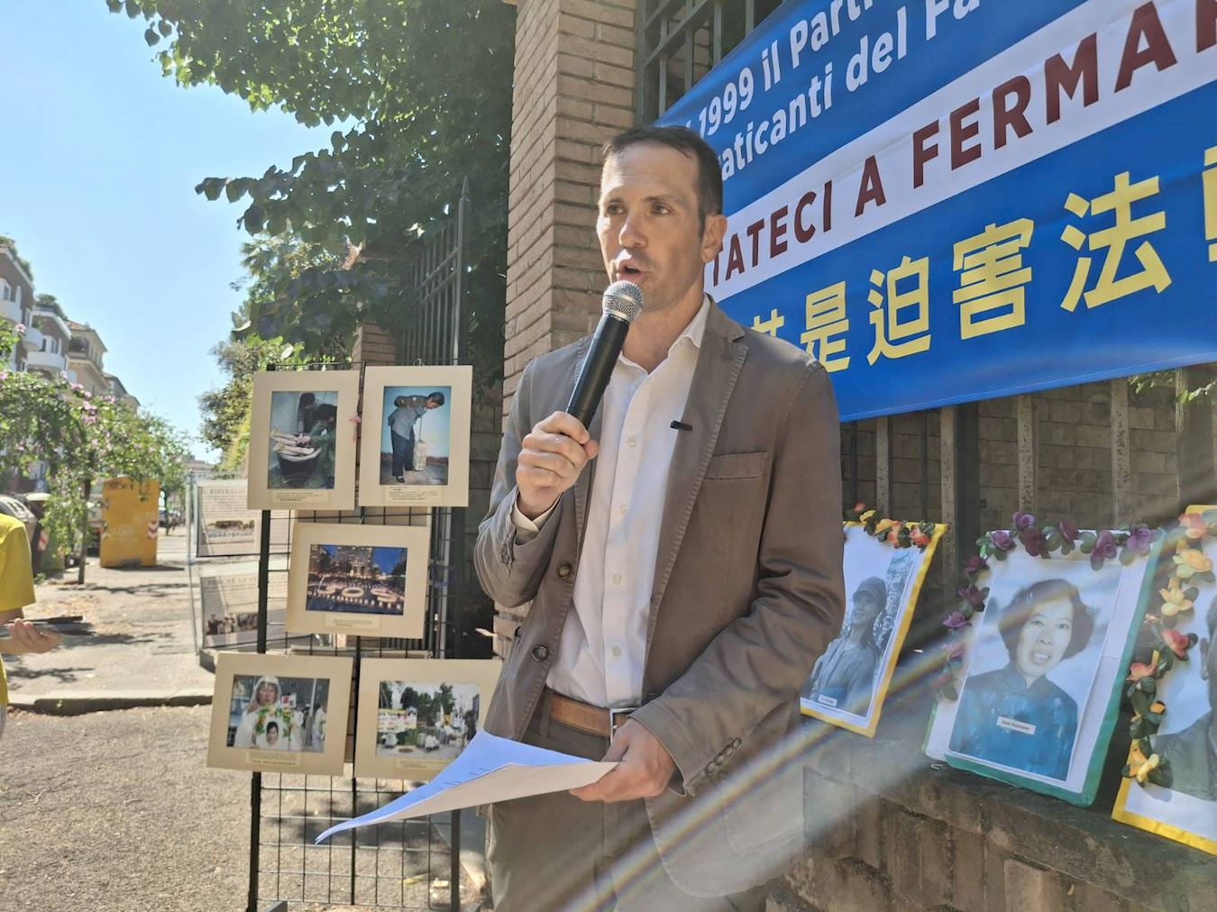 七月四日上午,罗马市议会副主席皮特兰杰罗·马萨罗(Pietrangelo Massaro)来到中共大使馆前法轮功学员集会现场并发言。来此之前,马萨罗先生刚刚向罗马市政府第十二区提交了“制止迫害法轮功、制止中(共)国活摘器官”的动议。
