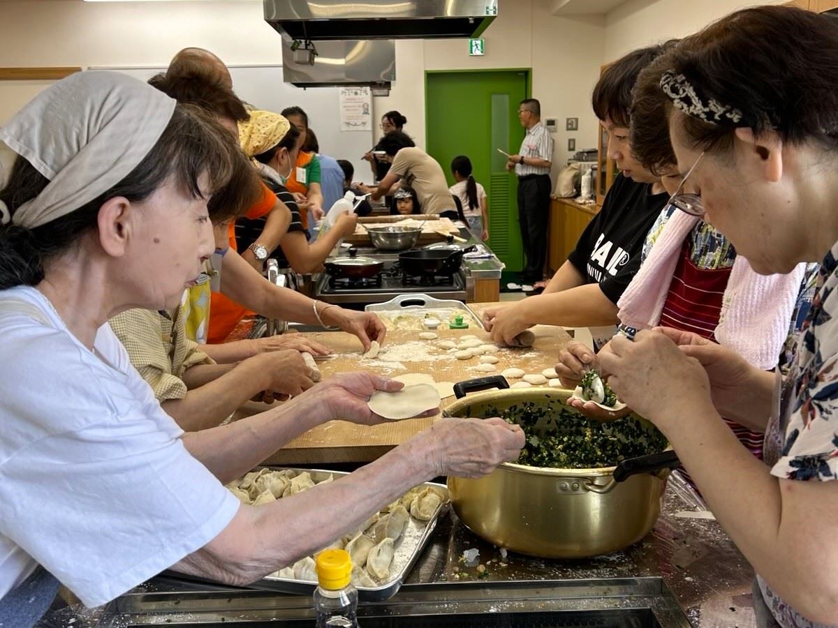 ![]() 图5:女士们跟法轮功学员学包饺子 |