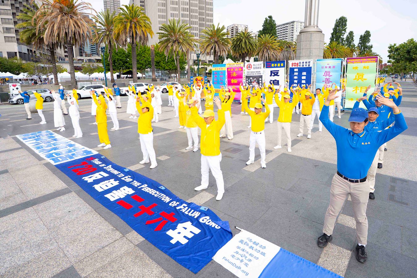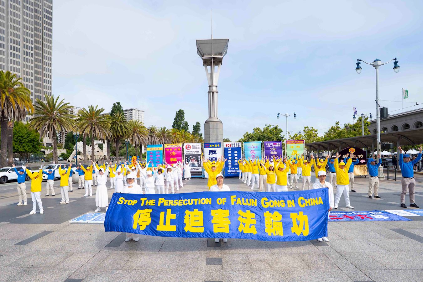 当天上午九点,法轮功学员首先在旧金山渡轮大厦(Ferry Building)前集体炼功,展示祥和优美的功法。许多居民和游客被吸引,了解什么是法轮功。有的人看到这么祥和的炼功场面,当场学炼法轮功。