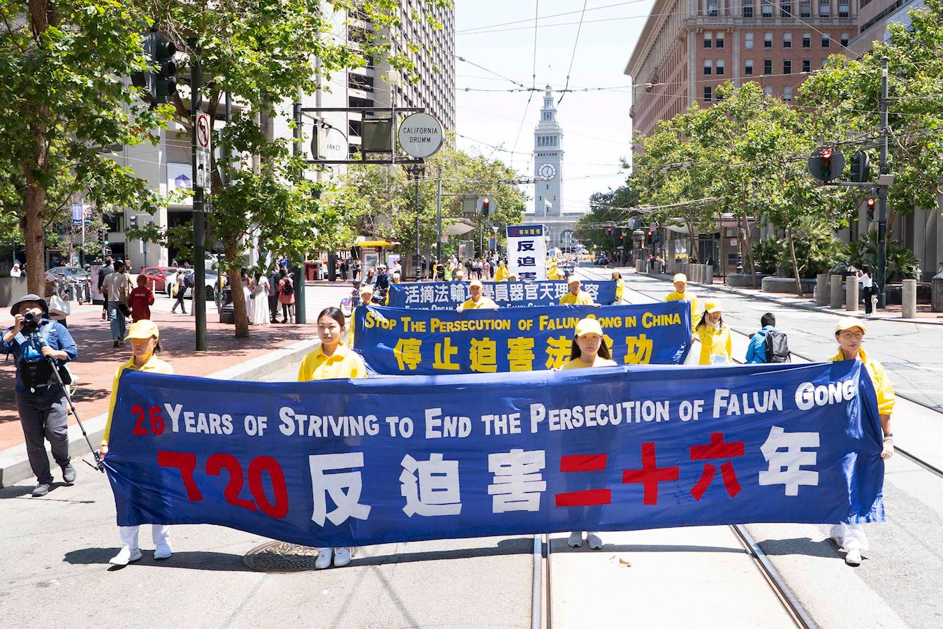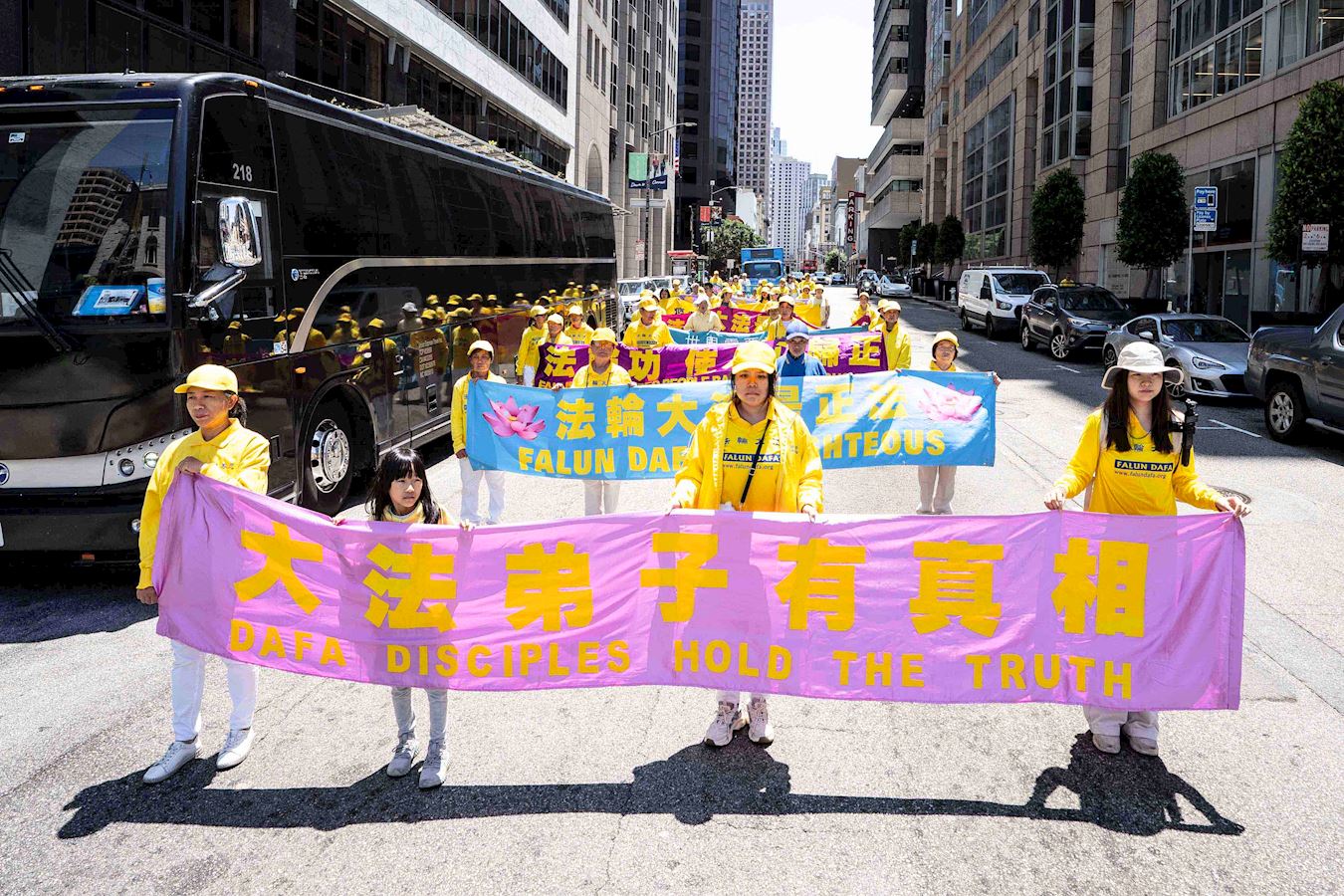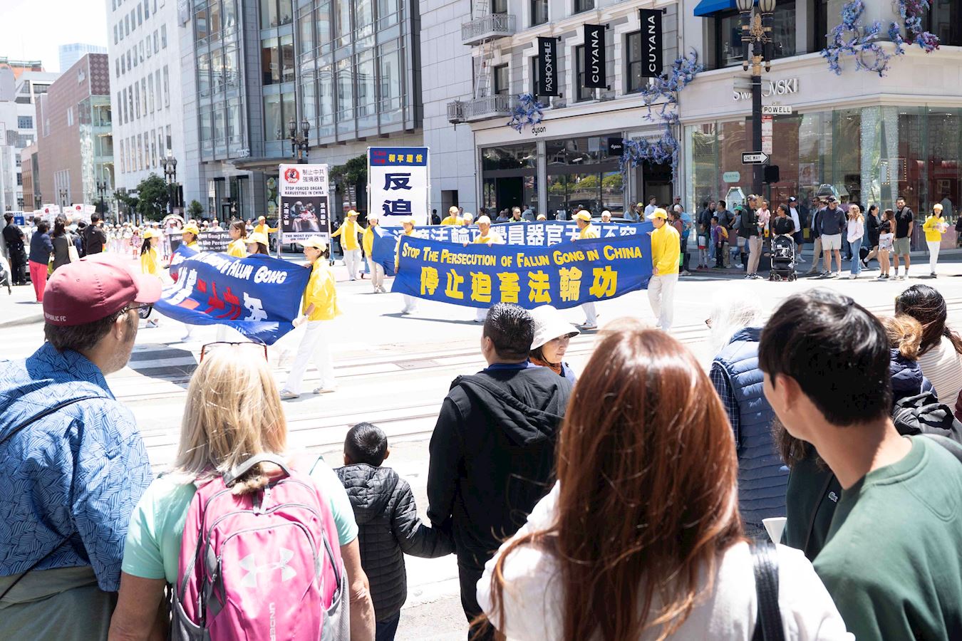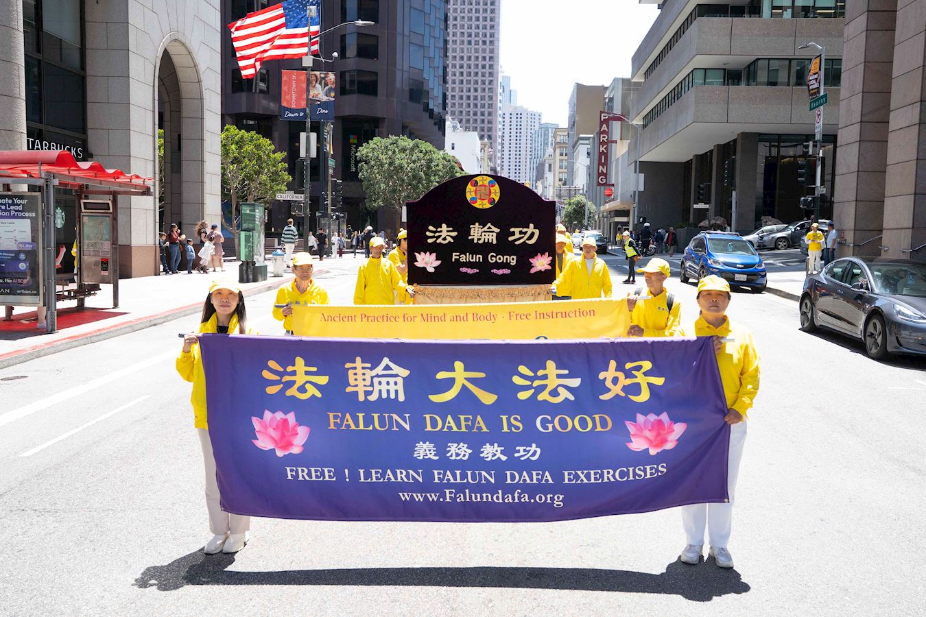 上午十二点,法轮功学员举行的游行,从渡轮大厦出发,沿着市场街、经过市区主要街道,到达唐人街花园角广场(Portsmouth Square)。