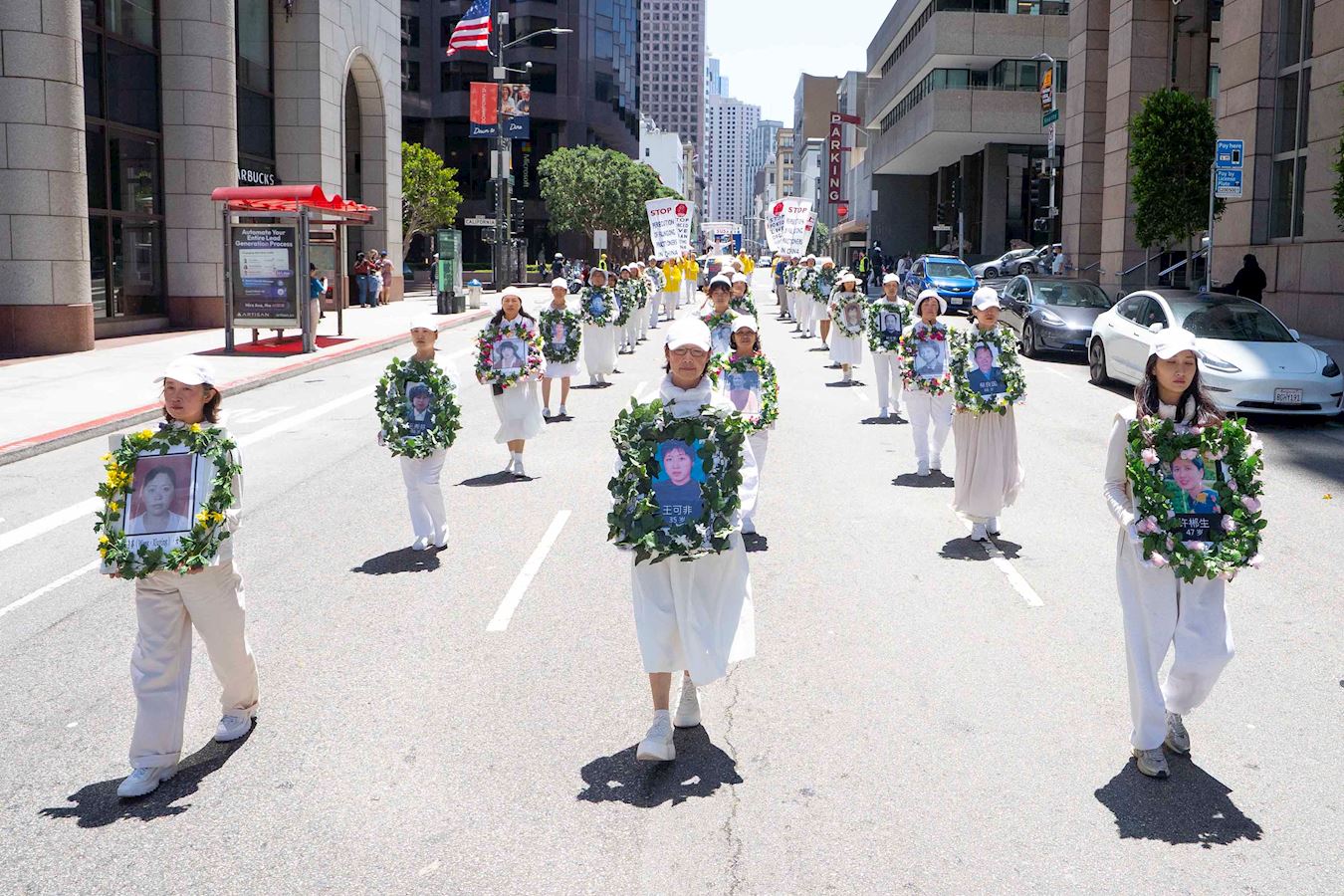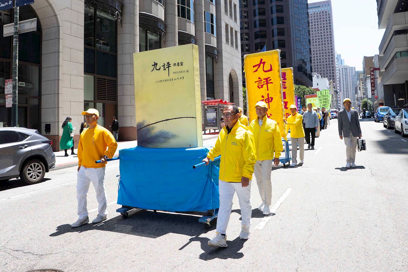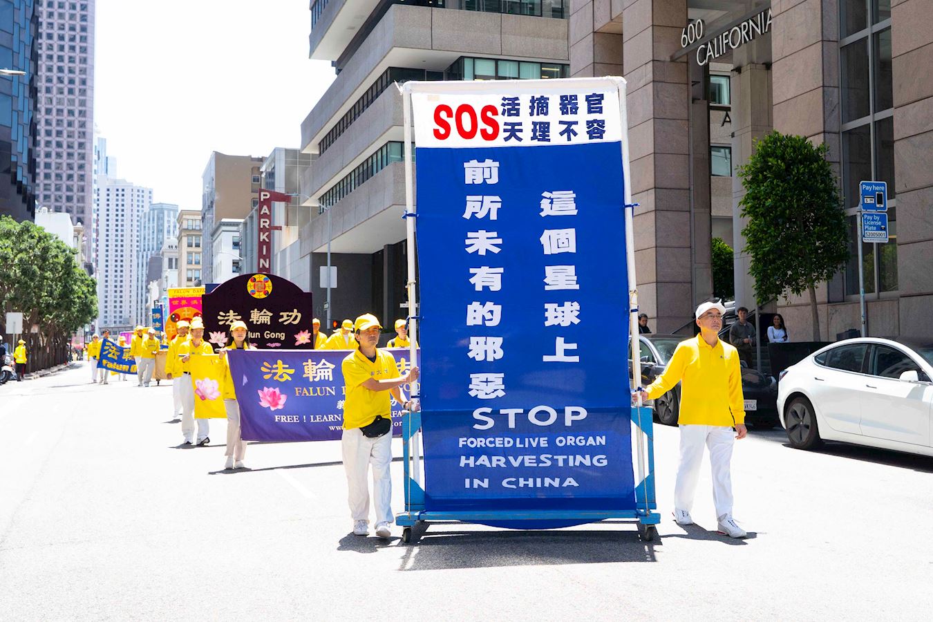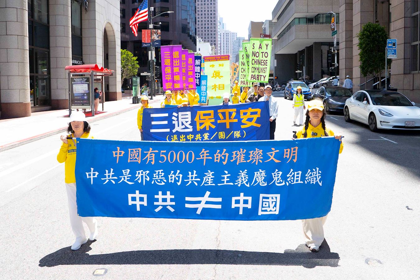 上午十二点,法轮功学员举行的游行,从渡轮大厦出发,沿着市场街、经过市区主要街道,到达唐人街花园角广场(Portsmouth Square)。