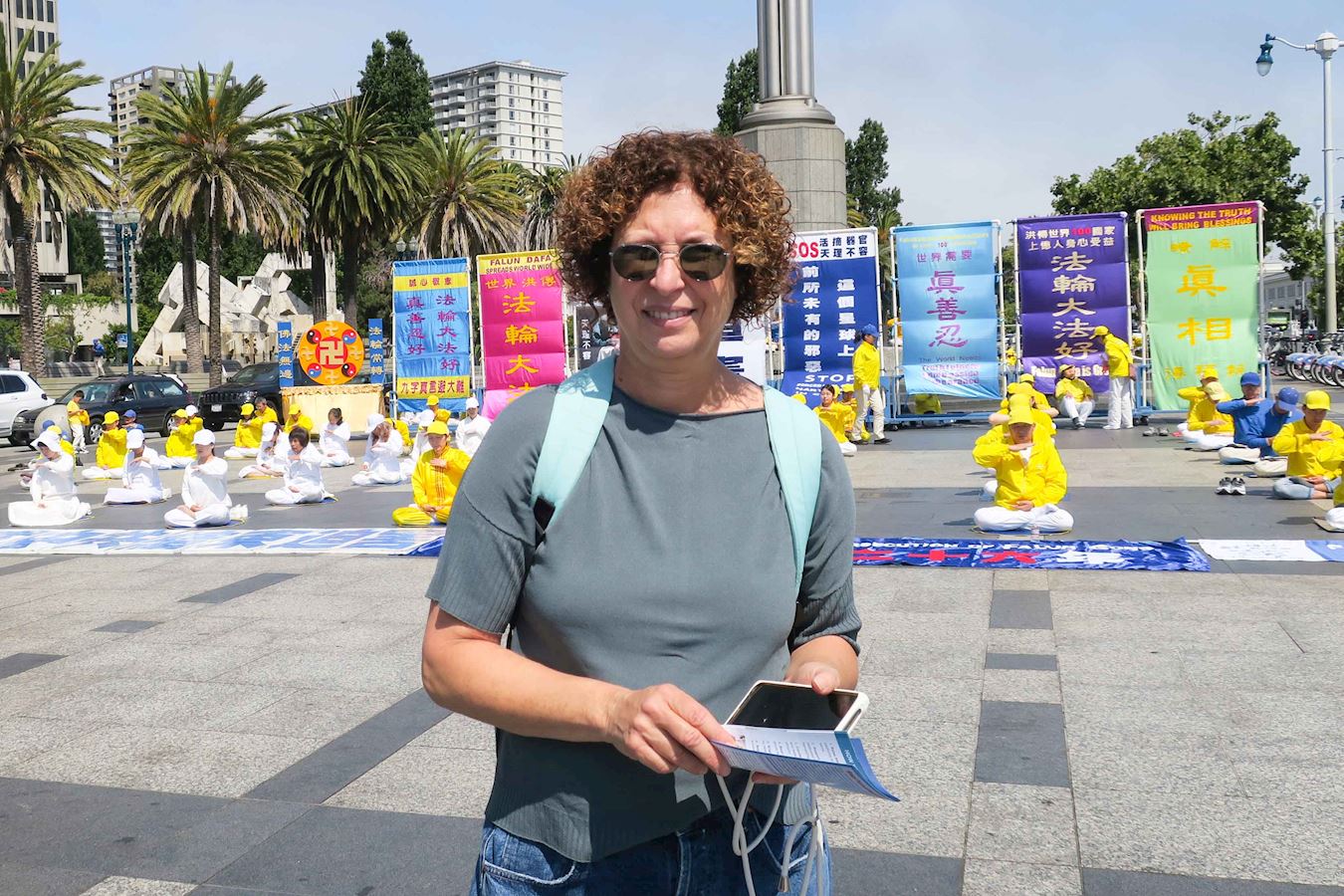 旧金山居民玛丽·安妮(Mary Anne)表示,她以前看见过法轮功学员炼功。她说,“每个人都应该遵循真、善、忍。现在有些人在散布谎言,所以我们需要真。我们应该善待彼此,宽仁大度。”