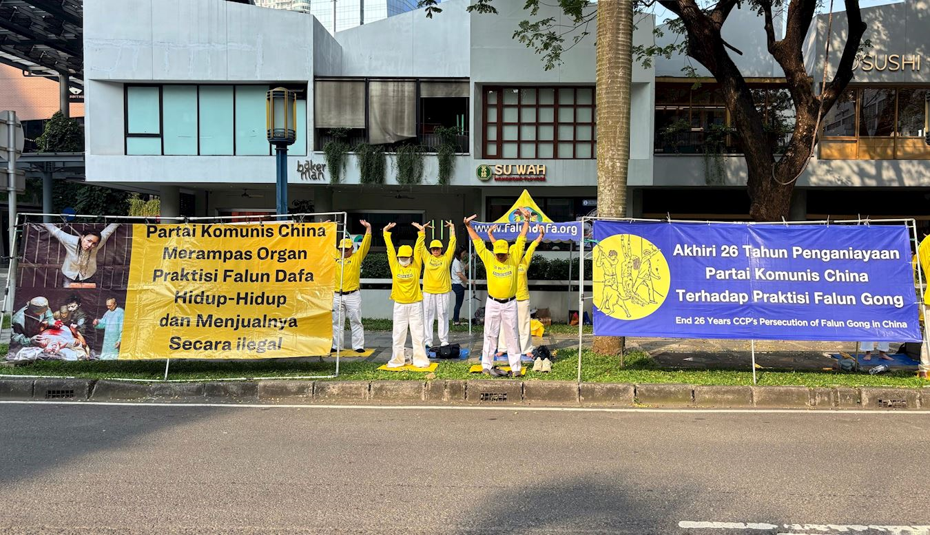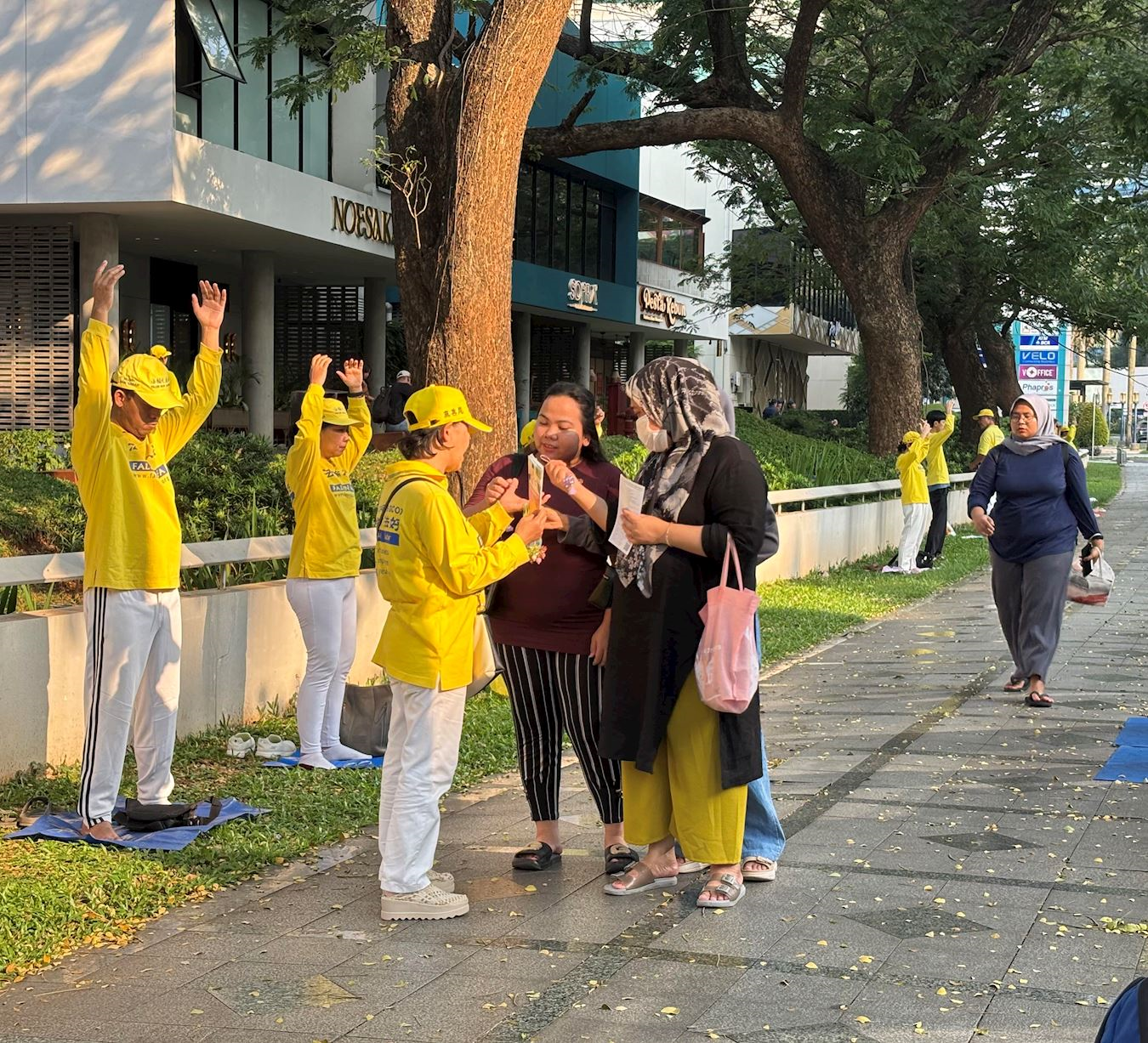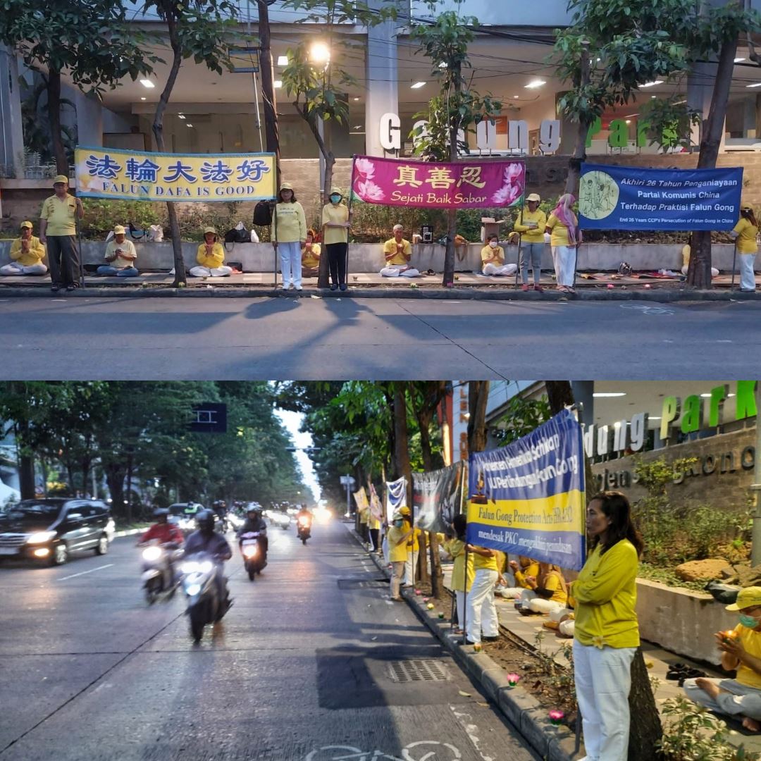 雅加达法轮功学员在中共大使馆前举行集会和烛光守夜活动,呼吁中共立即停止迫害。当天的活动以集体炼功开始,吸引了许多路人驻足观看。学员向他们赠送真相资料,讲述目前仍然在中国发生的严重侵犯人权的行为。人们称赞法轮功学员寻求正义和讲述真相的方式是和平和有尊严的。