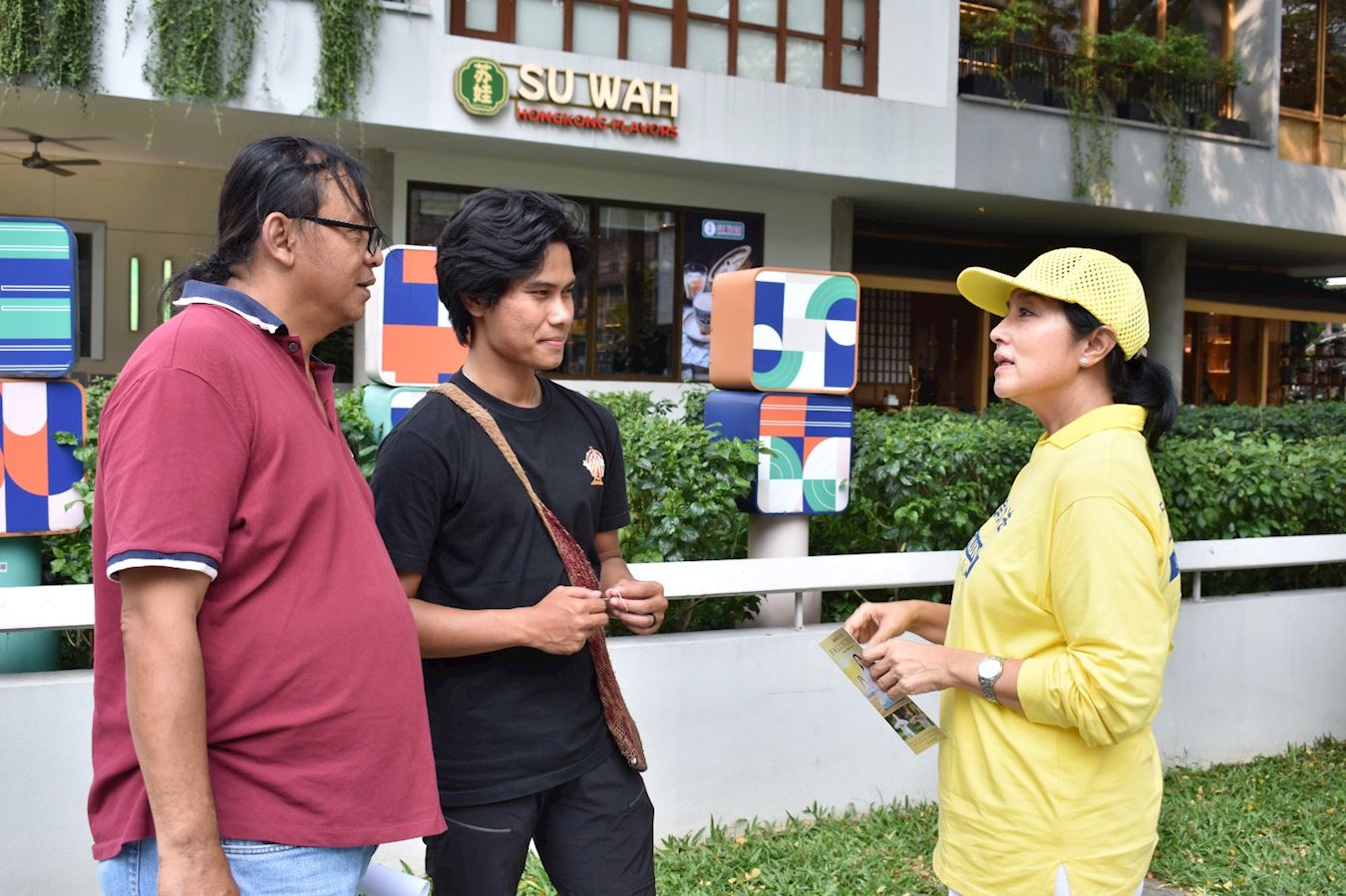 另一位路人出于好奇走近学员,询问为何举办这场活动。他还询问学员们在活动期间是否遭到干扰,并向学员表达了鼓励和支持。