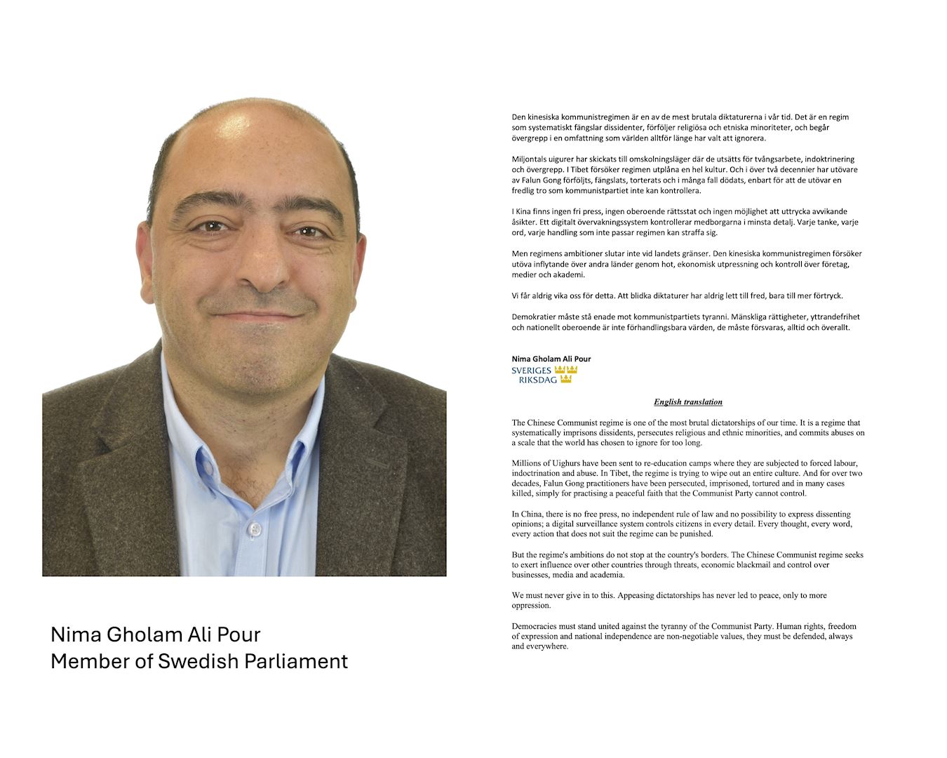 ![]() 图2:哥德堡市议员、对中政策跨国议会联盟联合主席之一蓝恩(E. Lann)及声明全文 |