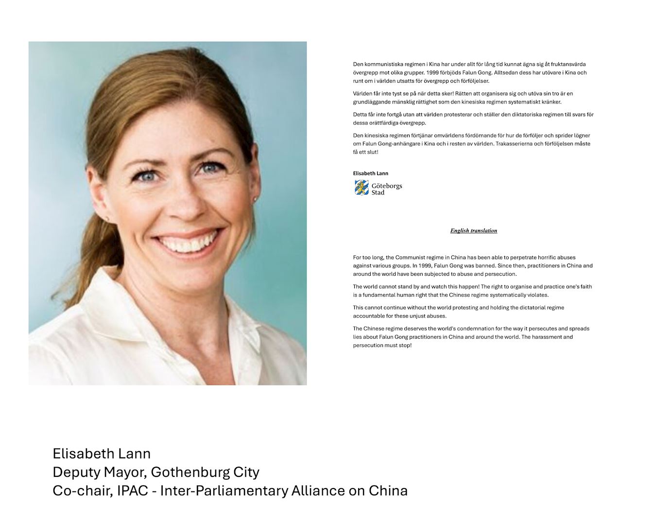 伊丽莎白·蓝恩(Elisabeth Lann)是哥德堡市副市长,也是对中政策跨国议会联盟(IPAC)联合主席之一。她在声明中说:“长期以来,中国共产党政权可以对各种团体实施可怕的虐待。 一九九九年,法轮功被禁,从那时起,中国和世界各地的法轮功修炼者一直遭受虐待和迫害。