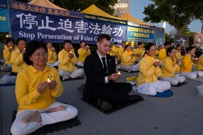 ![]() 图3:圣地亚哥县第二选区监事办公室社区代表纳撒尼尔·哈里斯(Nathaniel Harris)(左二)加入法轮功学员的烛光夜悼。 |