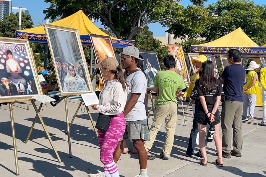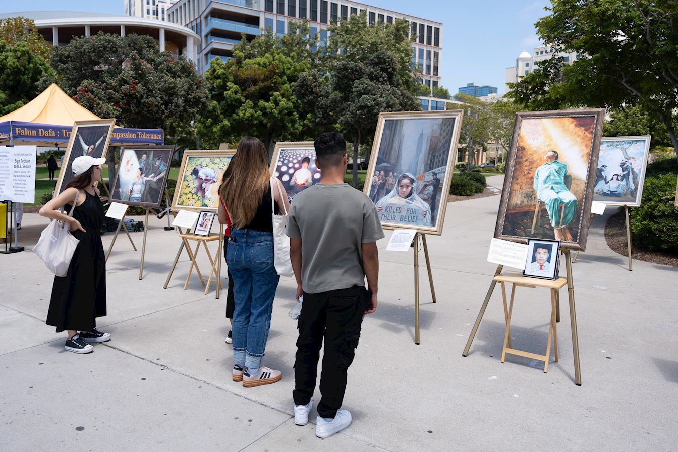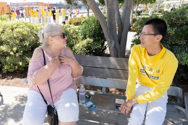圣地亚哥东郡艾尔卡洪(El Cajon)市议员米歇尔·梅切尔(Michelle Metschel)观看了画展并和法轮功学员进行了长时间交谈。当她听到法轮功学员讲述被迫害经历时一度落泪。