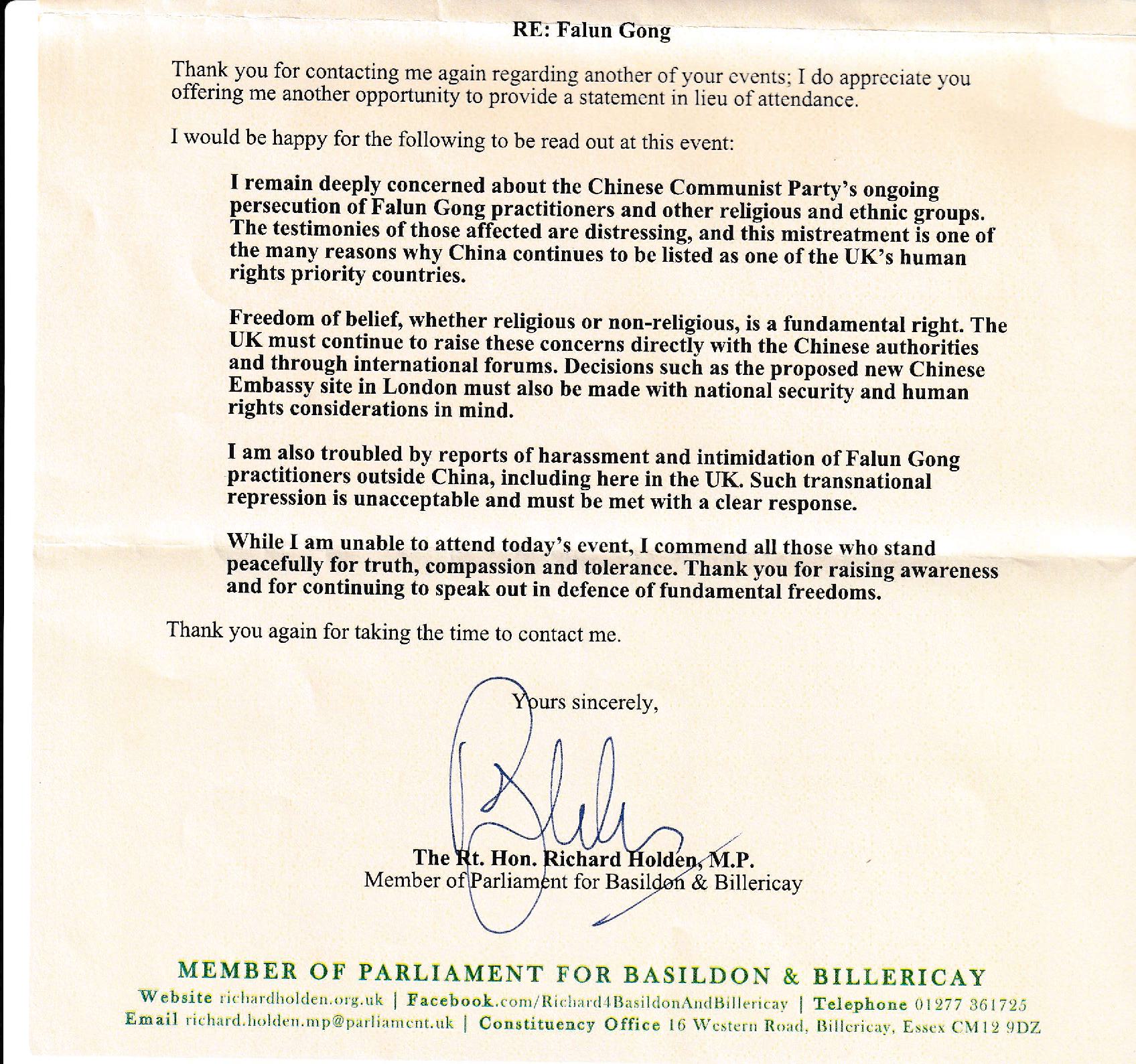 理查德·霍尔登议员(The Rt. Hon. Richard Holden MP)是英国保守党党鞭(议会事务协调人)和影子支付大臣,他在来信中说: