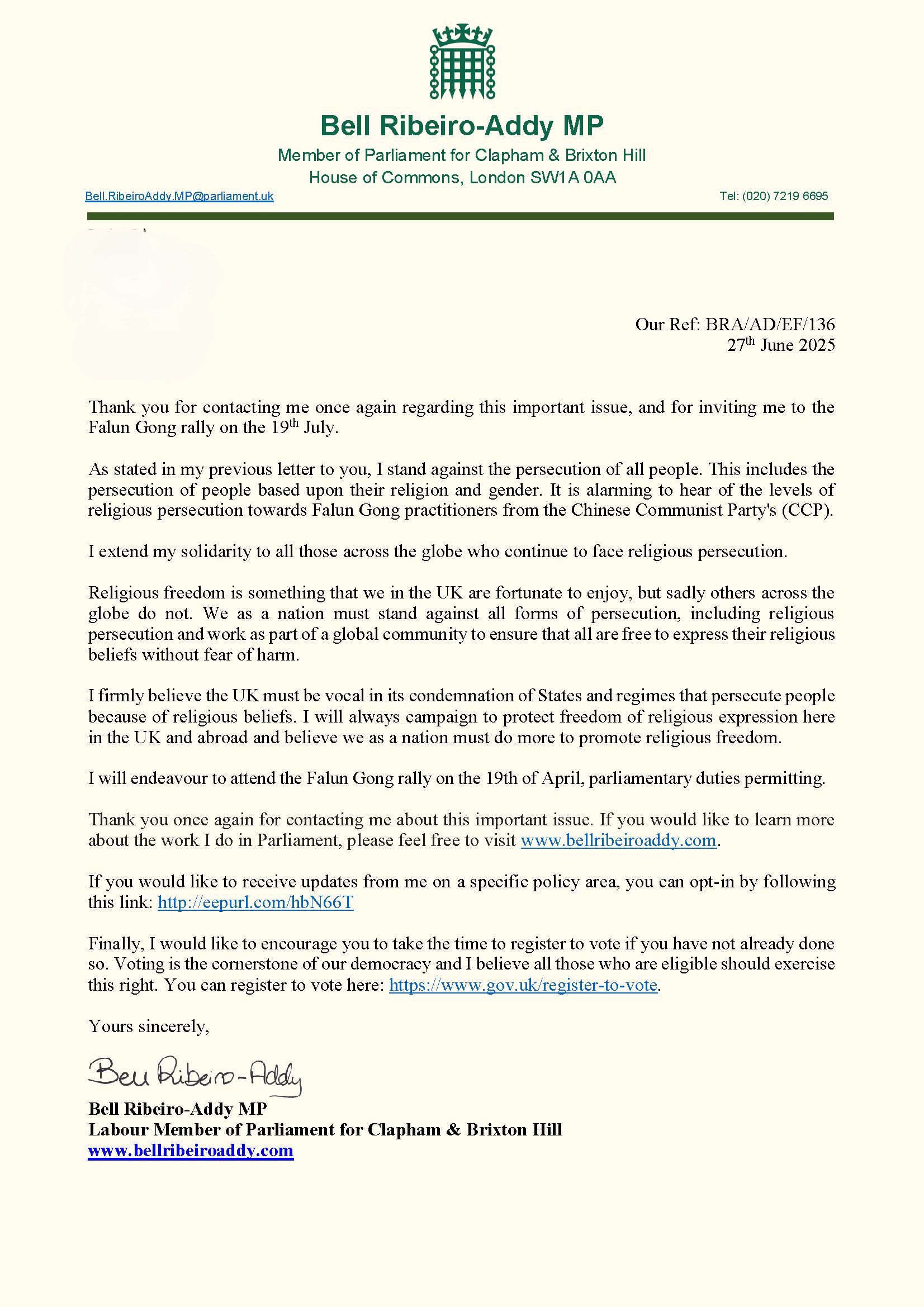 贝尔·里贝罗-阿迪议员(Bell Ribeiro-Addy MP)在来信中说: