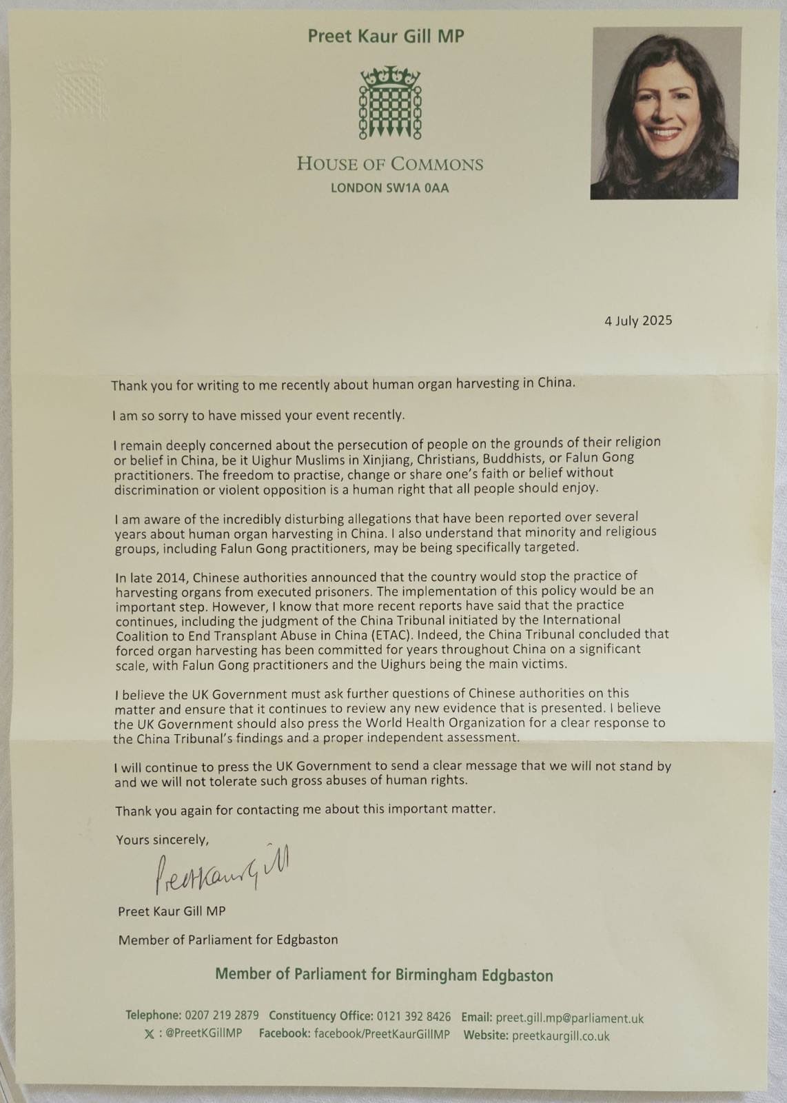 普里特·考尔·吉尔议员(Preet Kaur Gill MP)在来信中说: