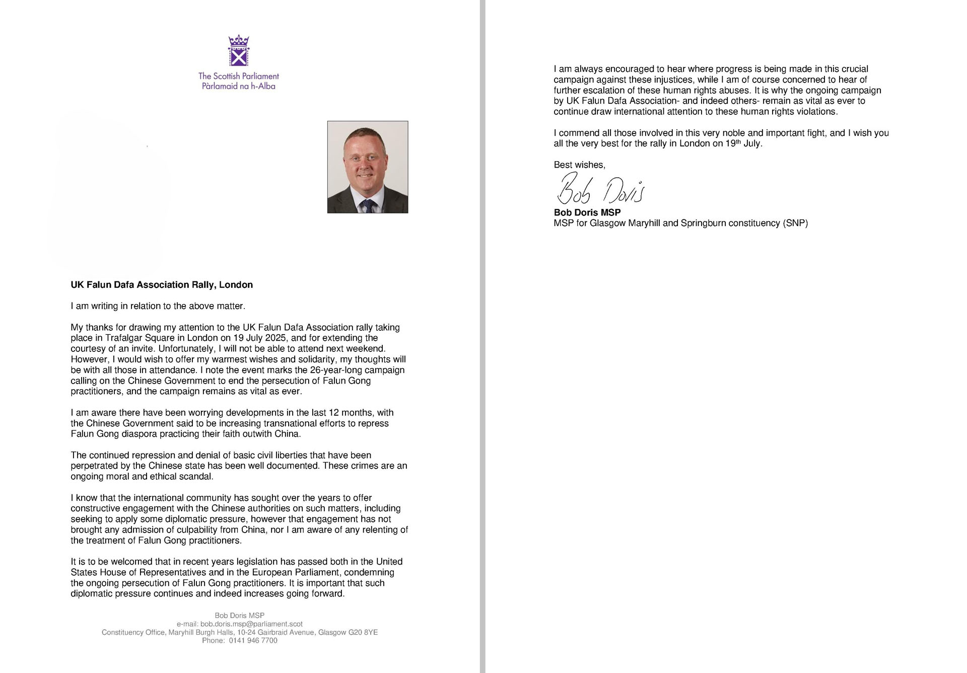 苏格兰议会议员鲍勃·多里斯(Bob Doris MSP)在来信中说: