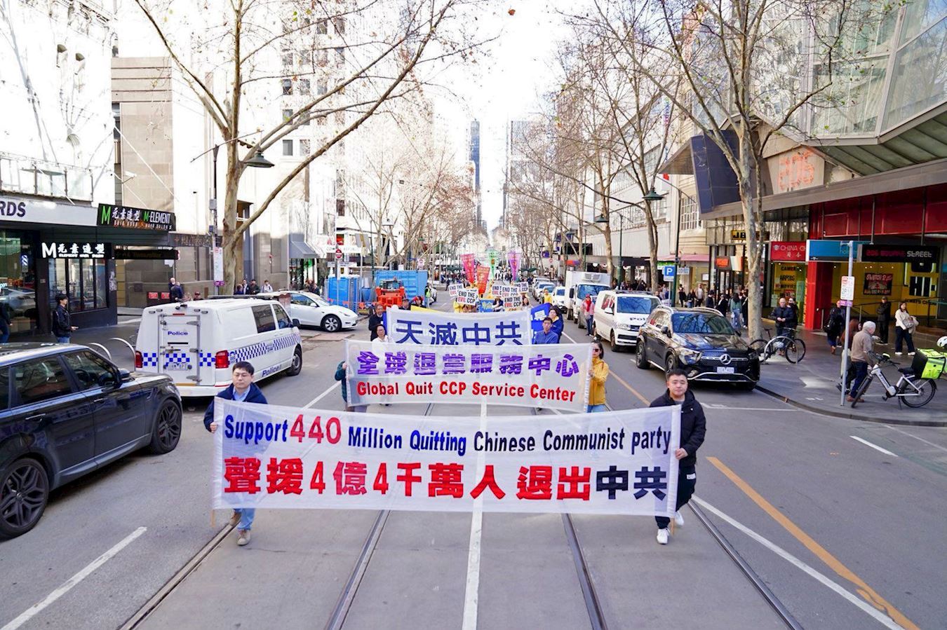 在游行队伍抵达终点——州立图书馆(State Library of Victoria)后,举行了反迫害二十六年集会,揭露中共最新的跨国打压行径,并声援4.49亿中国勇士“三:退.”(退出中共党、团、队组织)。
