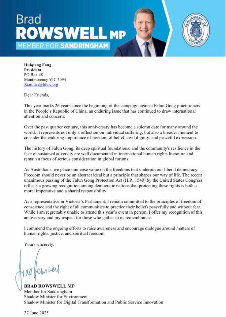 “作为维州议会的代表,我始终坚守自由意志的原则,支持所有群体和平且无畏地实践其信仰的权利。很遗憾我无法亲自出席今年的活动,但我谨向这个值得铭记的日子表示认同,并向所有共同缅怀的人们表达我由衷的敬意。