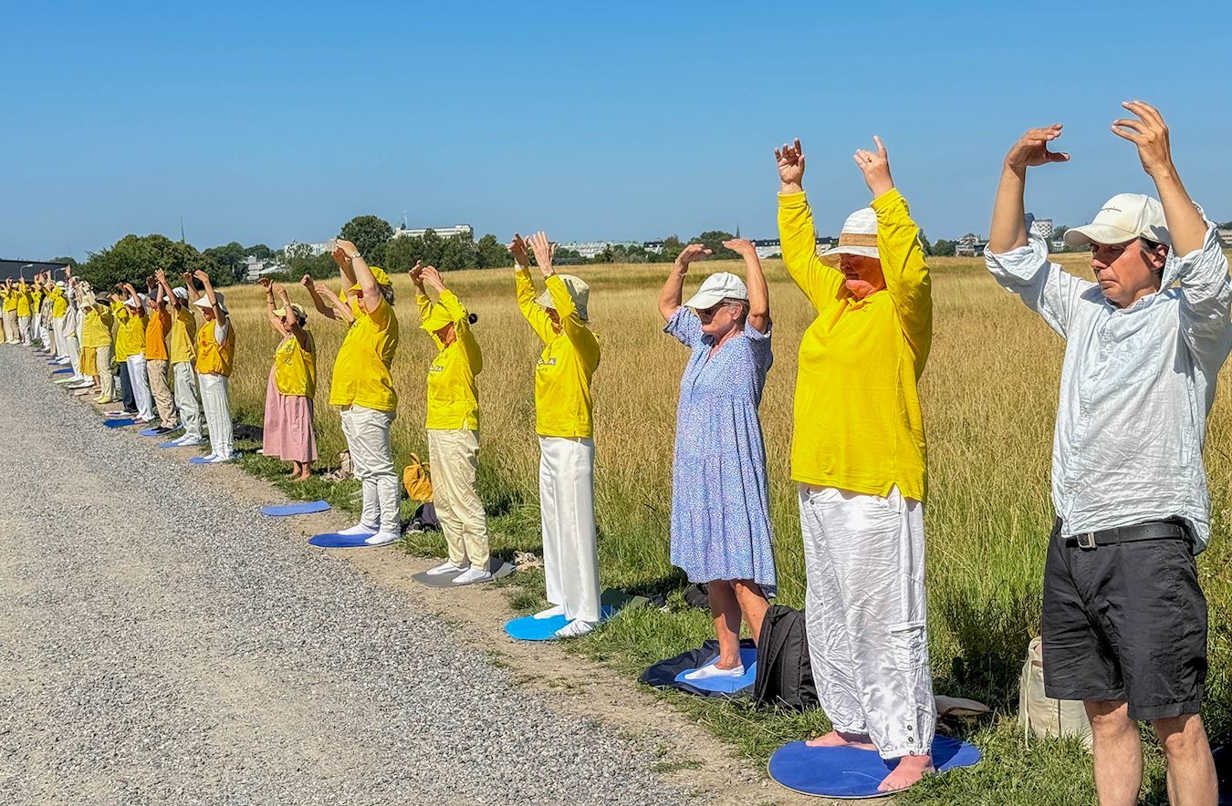 上午,法轮功学员在中使馆前草坪上展示法轮功的五套功法,向过往路人分发真相资料并征集签名。学员还向使馆内的工作人员宣读劝善信,并宣读了来自瑞典国会议员尼玛·古拉姆·阿里·普尔(Nima Gholam Ali Pour)和哥德堡市副市长、对中政策跨国议会联盟(IPAC)联合主席之一的伊丽莎白·蓝恩(Elisabeth Lann)发来的支持法轮功学员反迫害声明。活动现场平静祥和,过往车辆大多放慢速度缓缓驶过,或鸣笛向和平抗议的人群表达敬意。