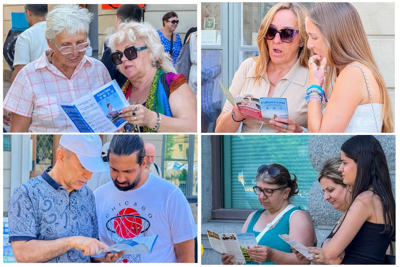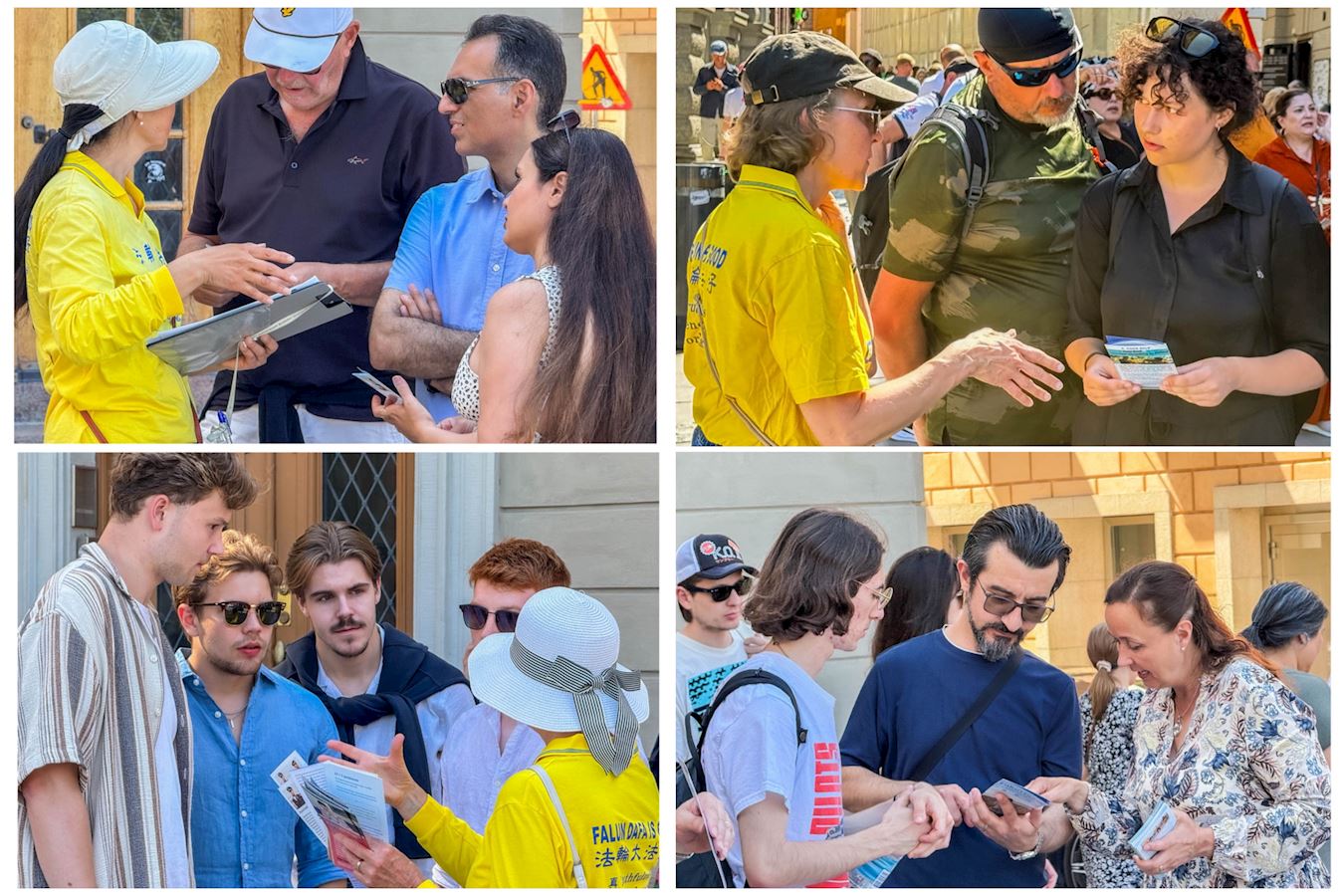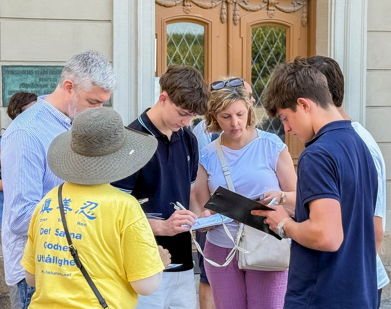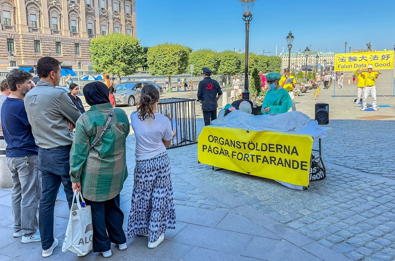 当天下午一点,法轮功学员在位于斯德哥尔摩市中心瑞典国会大厦旁的钱币广场,设立了讲真相展位,继续向当地民众及游客介绍法轮功,还通过模拟中共活摘人体器官贩卖的场景,揭露发生在中国的迫害真相。活动现场,主动前来了解真相、签名支持法轮功学员反迫害的市民和游客络绎不绝。