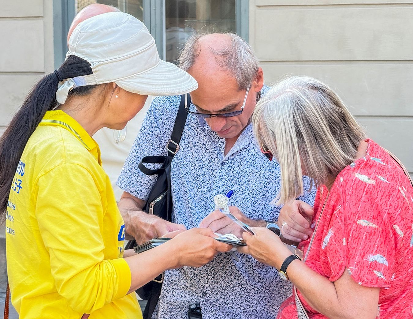 在她签名支持法轮功学员反迫害后,又走过来告诉学员:“刚刚我看到我的女儿也签名了,这非常好。现在我要去那边告诉我的丈夫和我们一起从美国来的朋友,他们都应该过来签名。你们这件事情做得太对啦!就是要让更多的人都来关注。(活摘器官)这种事情绝对不能容忍,不能再继续下去了。”母女俩希望其它国家也要动起来,“各国都联合起来采取行动、大家共同来制止迫害”。