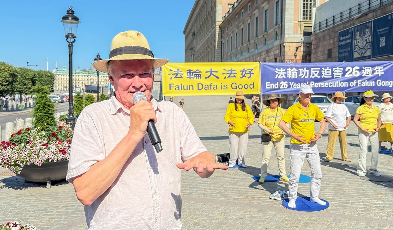 瑞典法轮功学员托比约恩(Torbjörn)曾是一位私企老板,现已退休。他是二零零一年十一月二十日去北京天安门广场打出真、善、忍横幅的三十六位西人法轮功学员中的一员。托比约恩讲述了自己修炼前一直在苦苦寻找真正的人生之路,“九八年五月当我接触了法轮功,阅读了《转法轮》后,感到这本书理白言白,原来我要找的都在这里了!修炼后,在工作生活中我努力遵循真、善、忍的原理,成为了一个幸福快乐的人。令人痛心的是中共造谣、抹黑法轮功,以及中国人受中共谎言毒害的程度令人震惊。在中国,警察居然说真、善、忍这三个字是违法的!”