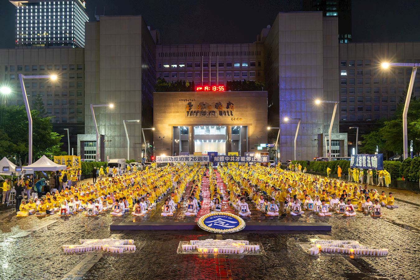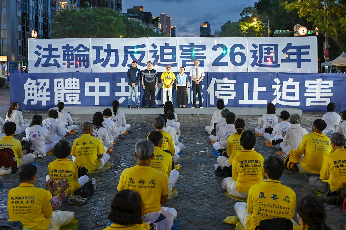 风雨阵阵中,法轮功学员端坐于市府广场前巍然不动,场面肃穆。台湾立委、议员、律师与民众也出席声援,共同呼吁国际社会正视中共暴行,制止这场延续四分之一世纪的人权灾难。