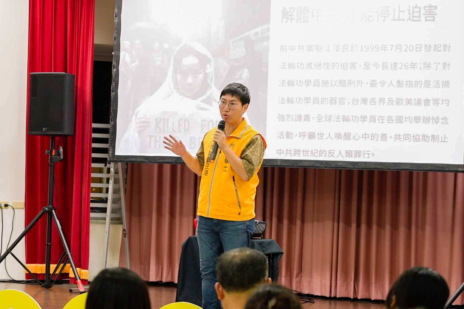 嘉义市议员林炜轩声援法轮功反迫害,他说:“人权是一个普世价值,也是社会文明很重要的象征。而中共没有人权、没有宗教信仰自由,它们更是违反人性,违反人道,无所不用其极的迫害不同信仰的团体,令人发指。”