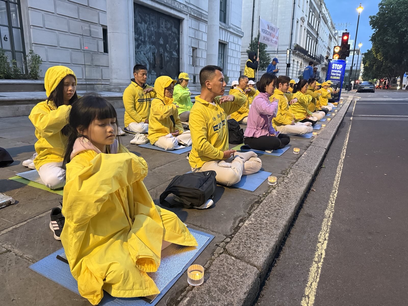夜幕低垂,伦敦中国大使馆外,结束了白天游行活动的部份法轮功学员,静静地聚集在这里,举行烛光守夜,悼念那些在被中共迫害中失去生命的同修。