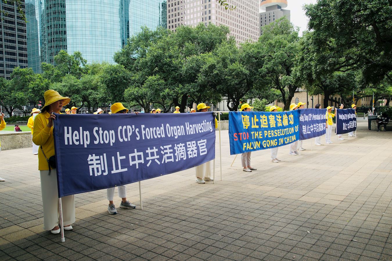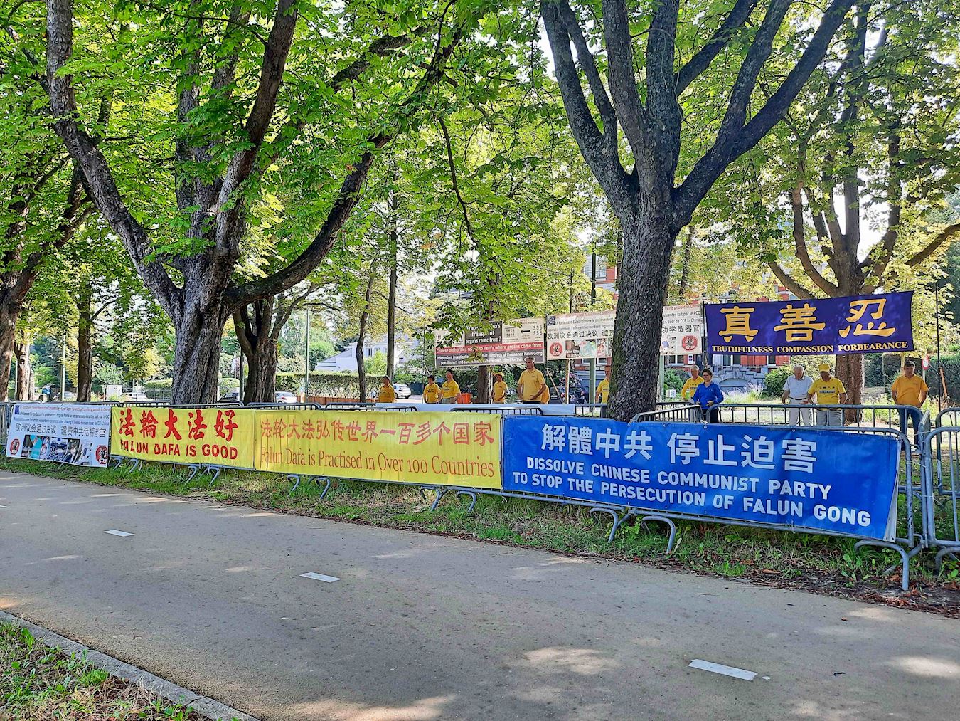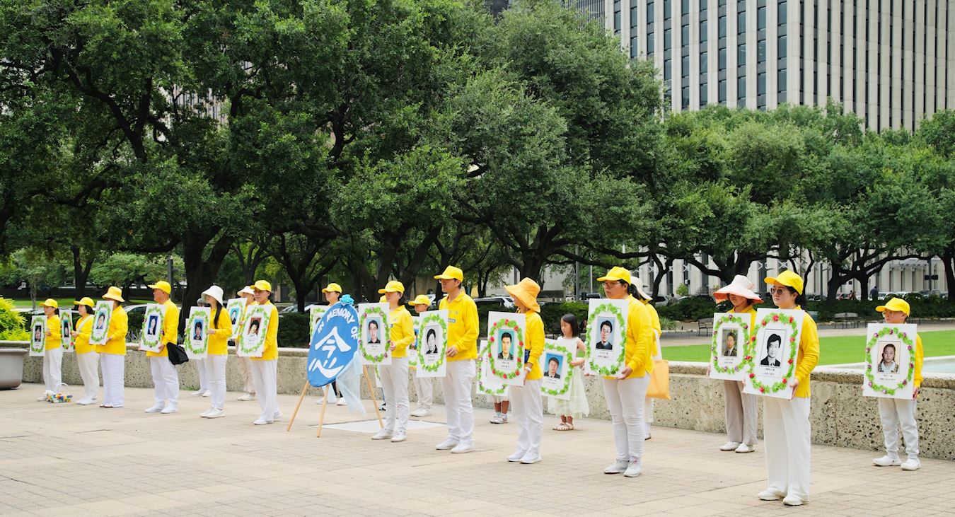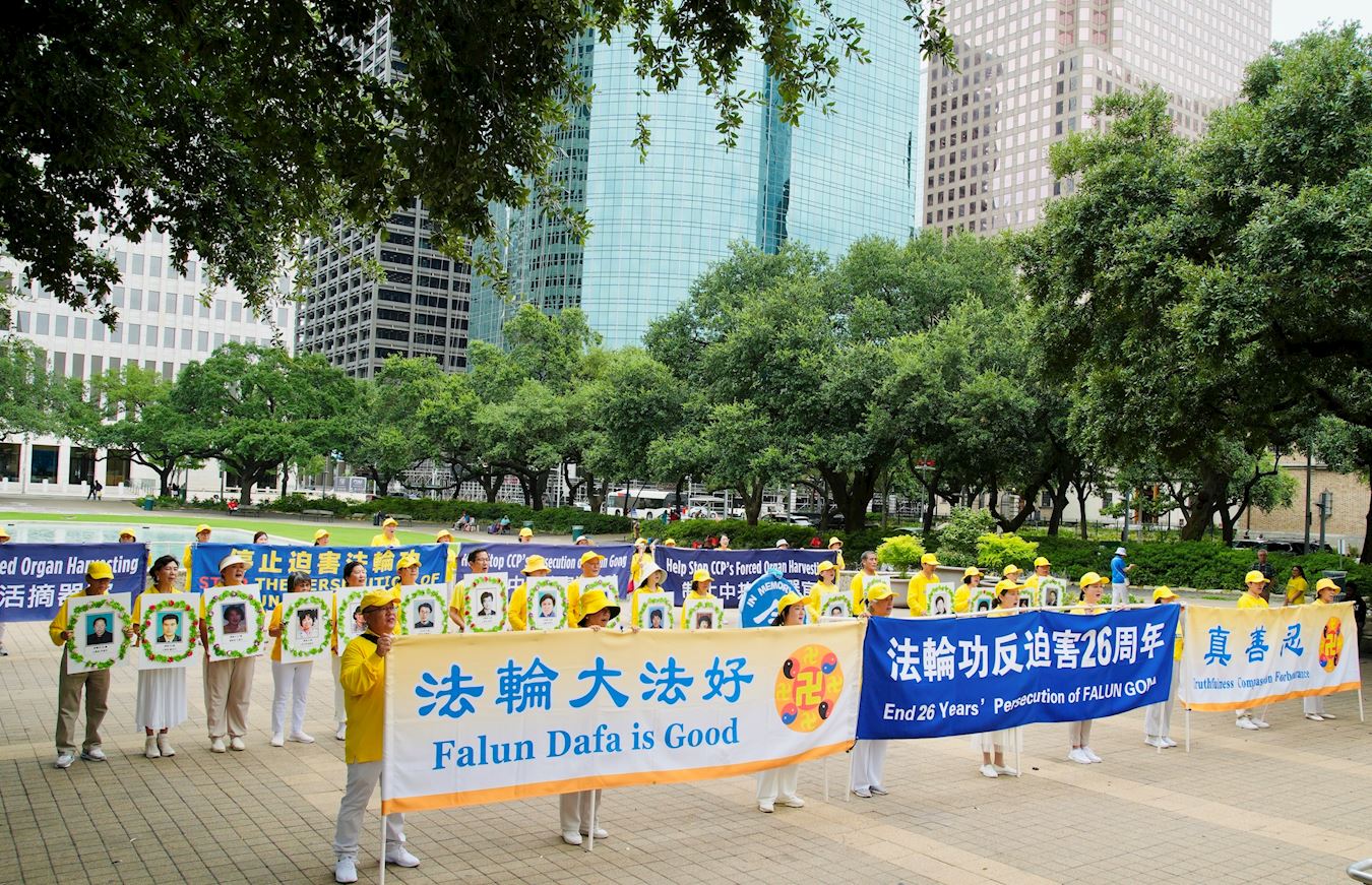 法轮功学员打出“中共迫害真善忍 天理不容”、“拯救善良 结束迫害”、“解体中共才能停止迫害”等大横幅,声援二十六年来面对迫害仍坚持信仰的中国大陆法轮功学员,同时有队伍拿着被迫害致死学员的照片,表达深切的悼念,并揭露中共各种迫害手段的残酷。